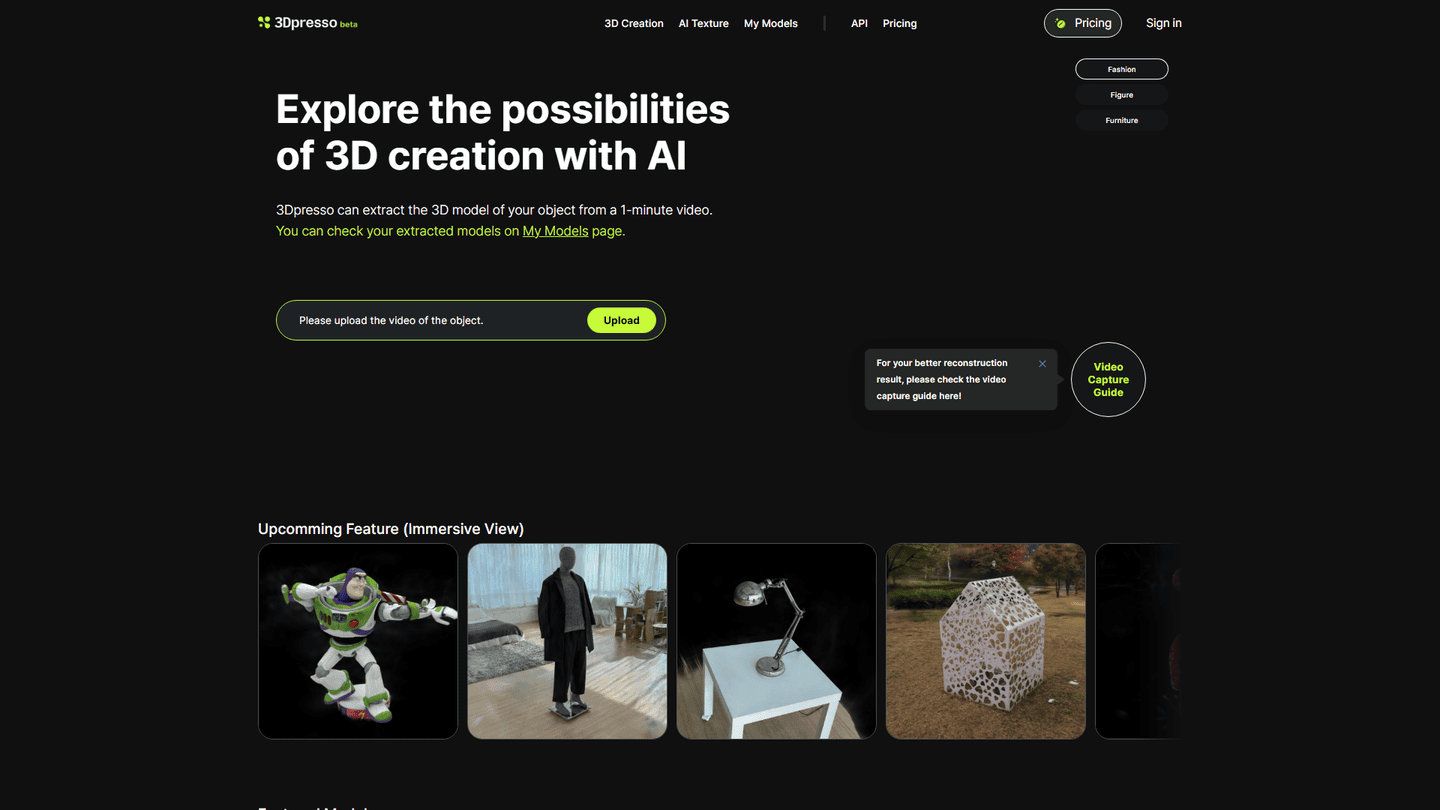 3Dpresso is a web-based platform that allows creators to extract 3D models by capturing a 1-2 minute video of an object and uploading it to the platform. The AI technology then extracts a 3D model of the object which can be viewed on the “My Models” page and downloaded in *.glb format. The platform also features an AI Texture function that applies multiple textures to a single model to create unique variations. Creators can change the texture of the 3D model by using text via generative AI prompts. The 3Dpresso capturing app, though optional, is recommended as it is more user-friendly, intuitive and powerful, allowing creators to capture more lifelike 3D models with ease. Users can access video capturing guide, FAQ, and creator tutorials on the platform. There is also a Discord community where creators can connect and chat with others, share their thoughts, ideas, and experiences. The service is provided by RECON Labs, and models of commercial products must never be used to manufacture the products themselves under any circumstances. The platform sends an email notification when the 3D model is available for download, which normally takes 30 minutes, depending on the video quality. Overall, 3Dpresso offers a convenient and accessible solution for creating 3D content using AI technology, without requiring advanced technical skills.