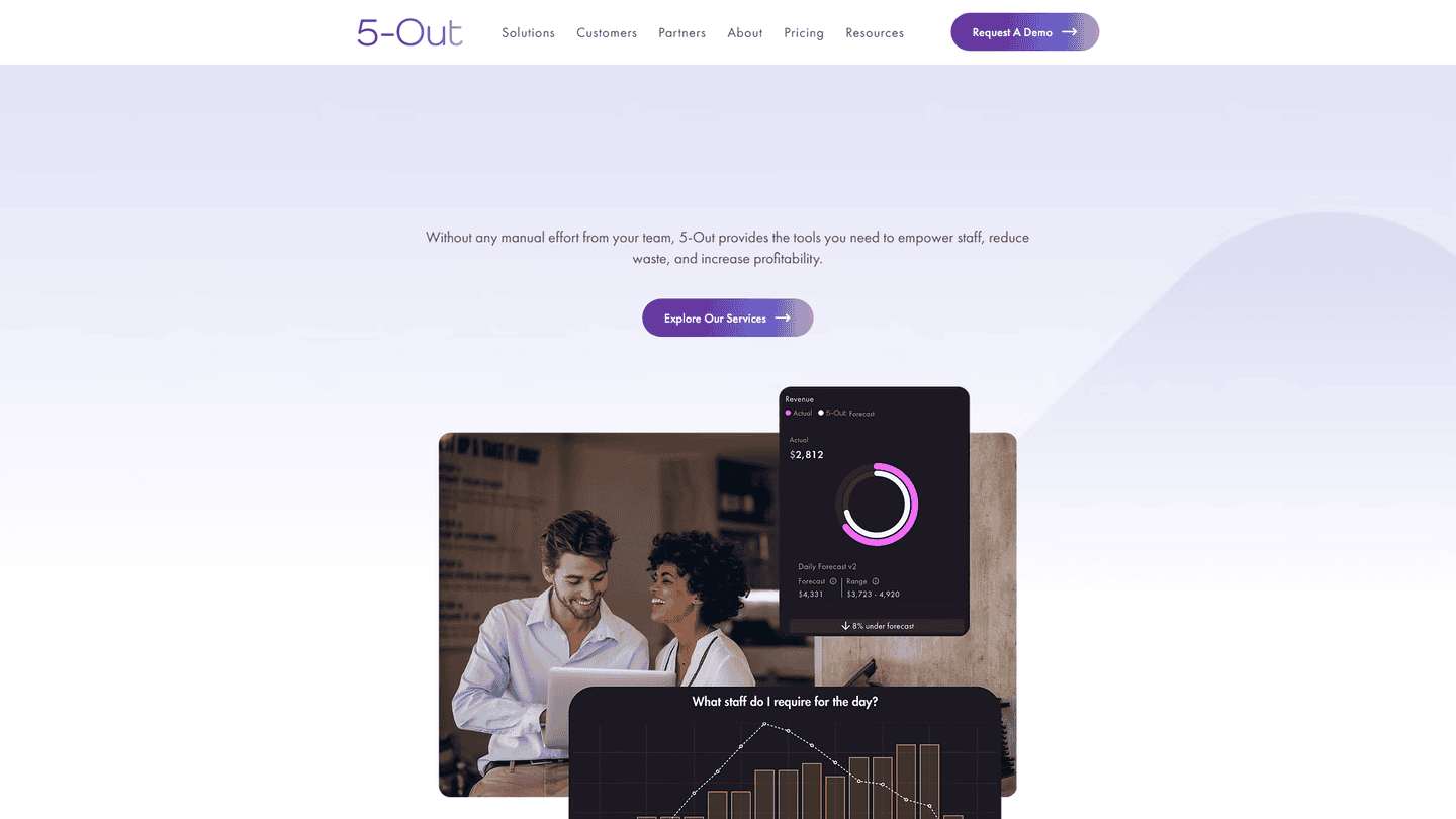5-Out automates the process of staffing optimization by predicting sales trends and adjusting labor scheduling in real-time to ensure profitability. It generates the optimal labor schedule for the business 1-2 weeks in advance.