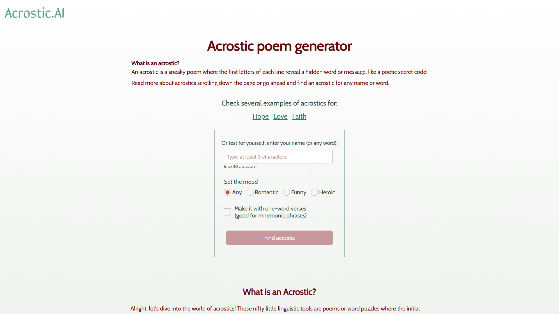 Acrostics for any word is an AI tool that generates acrostic poems based on any input word in order to provide users with a unique and creative way to express themselves. An acrostic poem is a type of poem where the first letters of each verse, line or paragraph form a word or message. With this tool, users can generate an acrostic poem for any word they choose by simply typing in their desired word or name, up to a maximum of 20 characters. The tool then uses artificial intelligence to create a poem by matching each letter of the input word to a phrase or sentence that starts with that letter, resulting in a unique and personalized acrostic poem. This tool is useful for individuals who want to express themselves creatively and offers an alternative literary outlet beyond traditional forms of writing. Additionally, it could be used by educators to create fun and engaging assignments for students to help improve their literacy skills. Overall, Acrostics for any word is a simple and user-friendly AI tool that enables anyone to generate unique and personalized acrostic poems in a matter of seconds.