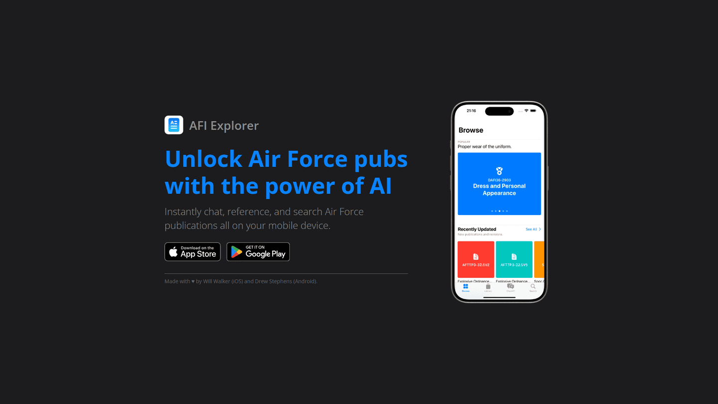 AFI Explorer is an AI-powered mobile application tool that optimizes and centralizes the usage of Air Force publications. It is primarily designed for users who need to regularly reference, chat about, or search through Air Force publications.