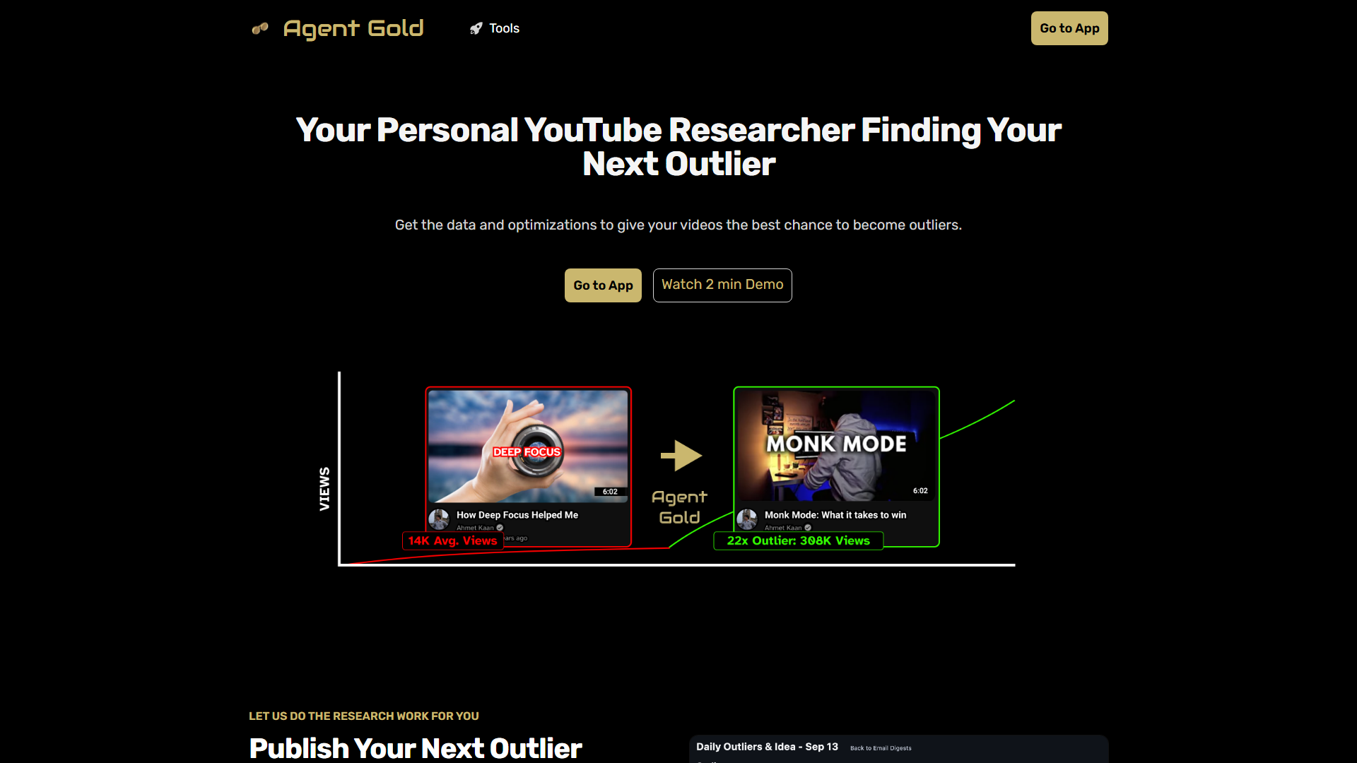 Agent Gold provides AI-driven insights and aids in refining your ideas, functioning as a marketing and analytics partner. It analyzes data from creators in your niche and offers actionable insights that can be used to improve your content and strategy.