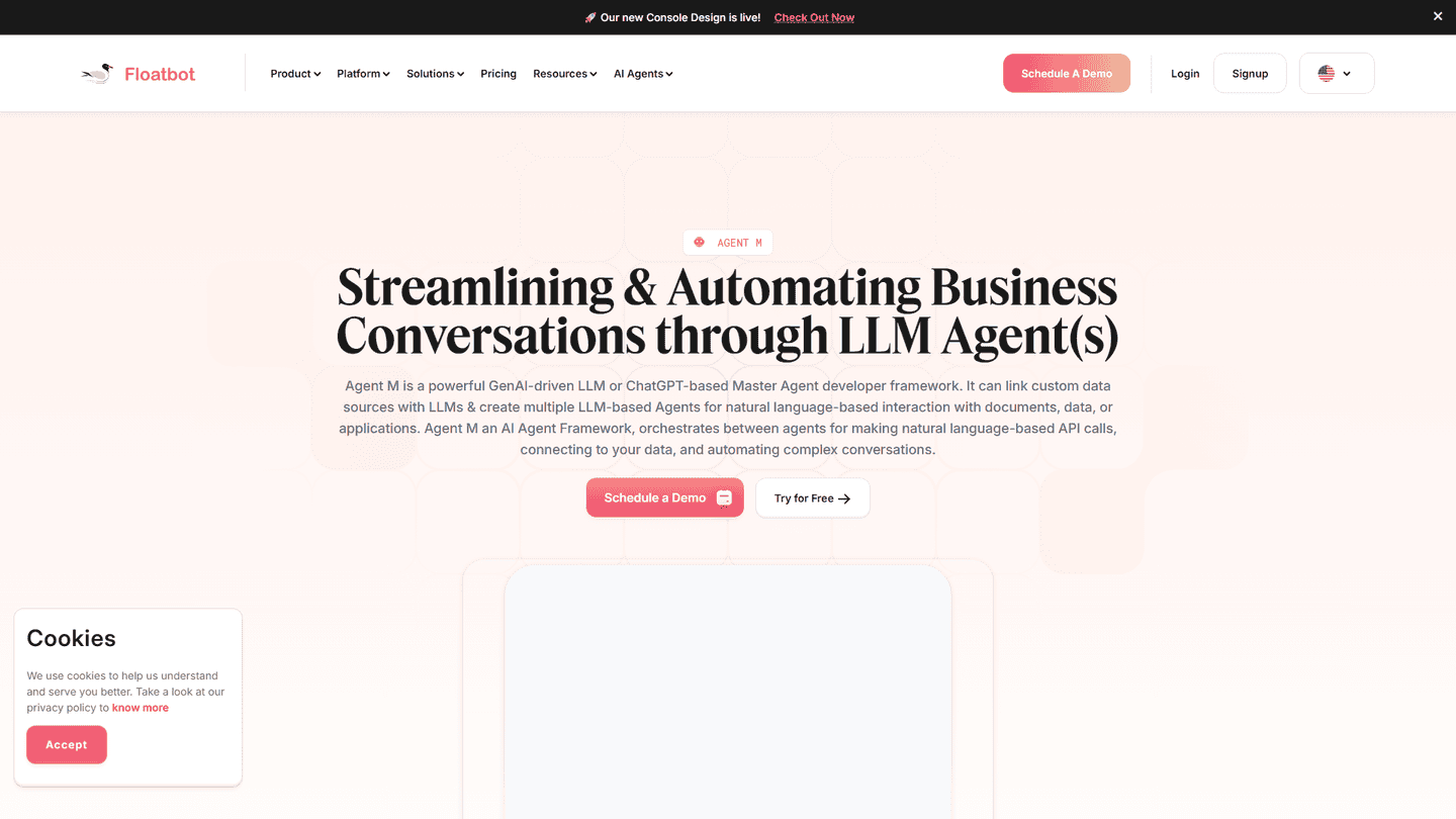 Agent M is an AI tool by Floatbot, specifically built to create, train and deploy intelligent virtual assistants (IVAs), also known as Agent LLM. The primary function of this tool is to automate complex conversations. This Generative AI-based Master Agent is designed to connect to your data, communicate with APIs, and provide solutions to intricate problems. Agent M encapsulates a variety of features provided by Floatbot like omnichannel chatbots, voice AI that supports multiple languages, live chat with a co-browsing solution, AI Agent Assist if human intervention is needed, real-time ASR for voice-based applications, and advanced voice recognition technology for security purposes. It is also capable of cognitive search, allowing it to enable self-learning from unstructured data for your conversational AI bots. Thanks to these capabilities, Agent M can significantly boost productivity, foster efficient collaboration, and greatly improve the customer experience. Agent M is designed to be used in various industries such as banking, insurance, and BPO, among others. It provides a free trial for users who would like to explore its features and functionalities before availing of the service.
