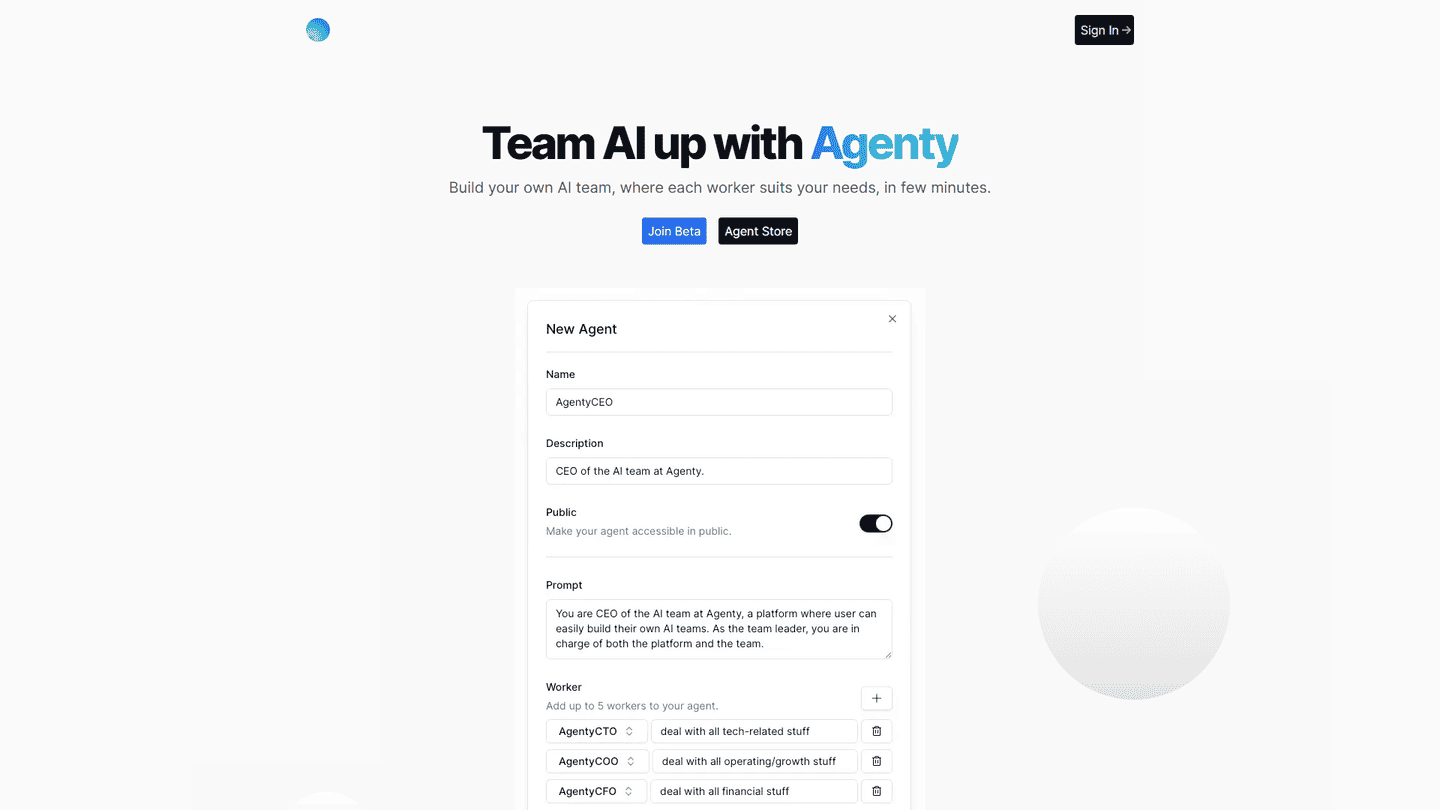 Agenty: Team AI Up is an artificial intelligence platform designed for the creation of customized AI teams. The primary purpose of the platform is to cater to the specific needs of its users by allowing them to build unique AI teams through an offering of diverse AI worker models. Based on the user's individual needs, these AI worker models can include a range of functionalities, processes, and capabilities. The platform is built with the intent of creating a simplified process that can deliver results in a short span of time. Currently, Agenty is in the beta testing phase, inviting users to participate in and contribute to its evolution. A key feature is the Agenty Store, which possibly offers users access to additional tools, resources, or extended services. Note that details and availability of certain features may change as the platform evolves.