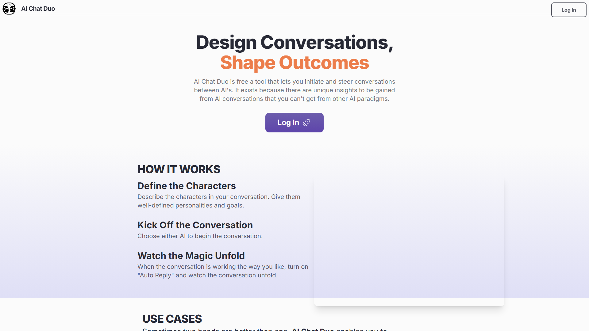 AI Chat Duo is an AI tool designed to create engaging and customizable conversational interactions. Users can design scenarios, define AI characters, and control the conversation to generate unique insights and learning experiences.