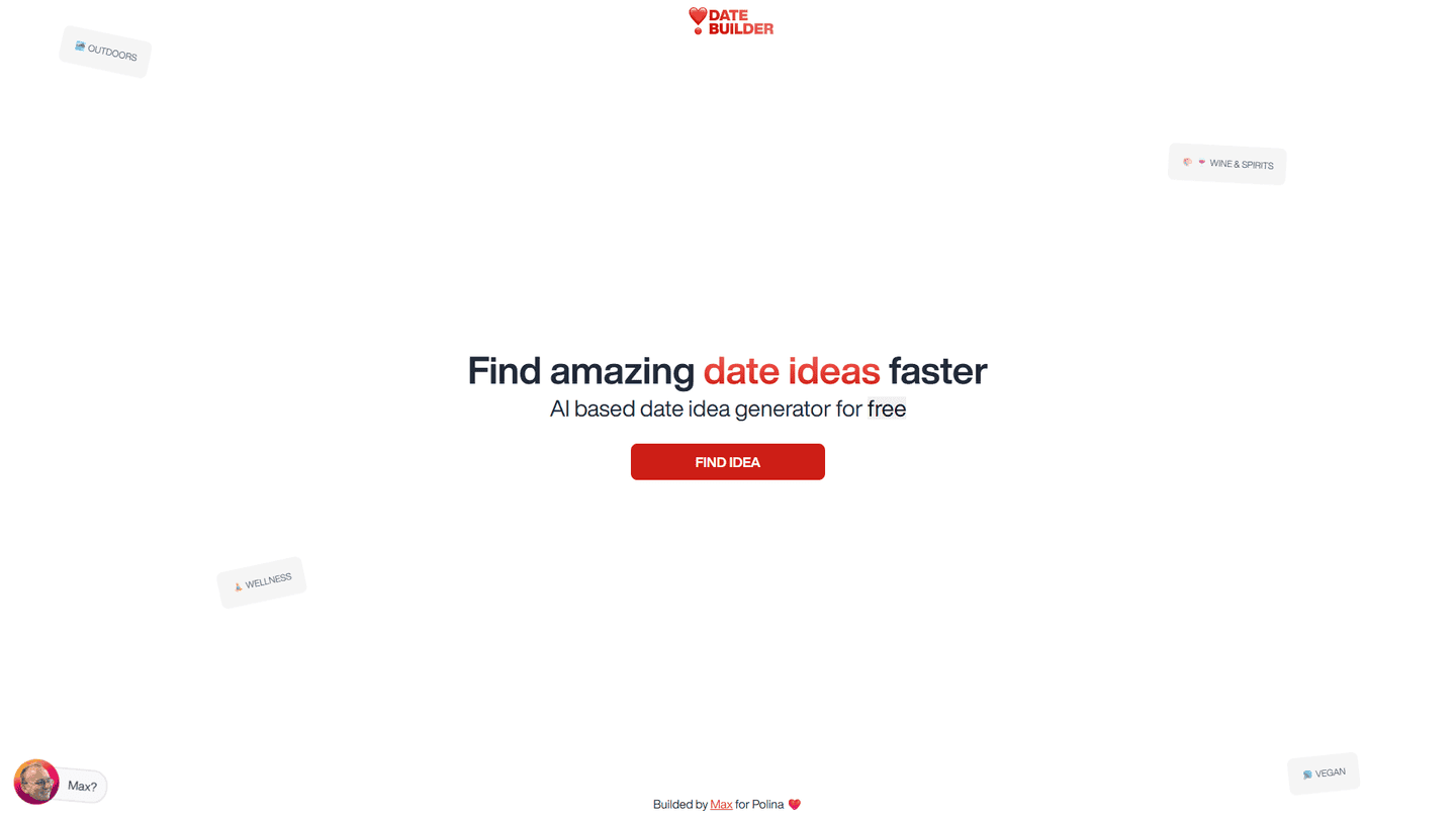 AI Date Ideas is an innovative tool developed by Max. Aimed at aiding users, especially those referred to as 'Date Planners', this unique platform utilizes artificial intelligence to generate creative date ideas. The tool is built around the user's interest in various themes, such as outdoors, wellness, wine and spirits, and veganism. The system's design includes a generator for producing date ideas, which are then presented to the user free of charge. The functionality of the tool is focused on speed and ease of use. It allows for quick generation of ideas, reducing the time and effort needed in planning a date. Over time, the developer maintains the tool and occasionally shares progress updates through Twitter. It's worth noting that this tool was a passion project of the developer, originating from his one month of learning web development skills. Despite this fact, the tool's functions serve a broad audience, with a focus on those who seek out new and interesting date ideas.