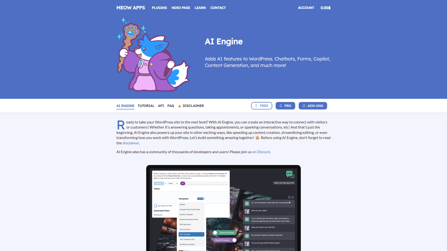 The AI Engine: GPT Tools & Chatbot for WordPress is a plugin that harnesses the power of AI to enhance a user's WordPress experience. With AI Engine, users can generate fresh and engaging content for their site using the GPT technology. Additionally, users can try out a variety of tasks in AI playground, such as translation and correction, to improve their site's performance. The plugin also enables users to add a ChatGPT-style chatbot to their website, which can be customized to fit the website's branding and style. AI Engine allows users to create datasets and fine-tune AI models to make their website even more impressive. The plugin also comes with an API for other plugins to tap into. AI Engine has a free version and a pro version, both containing the chatbot feature, content and image generators, and much more. The pro version offers additional features such as AI forms, content-aware chatbots, statistics, and limits. AI Engine is highly customizable, and users have full control over the plugin's features. Before using AI Engine, users are advised to read the disclaimer. Overall, AI Engine is a powerful tool that enables users to harness the power of AI to improve their WordPress site's content, performance, and user experience.