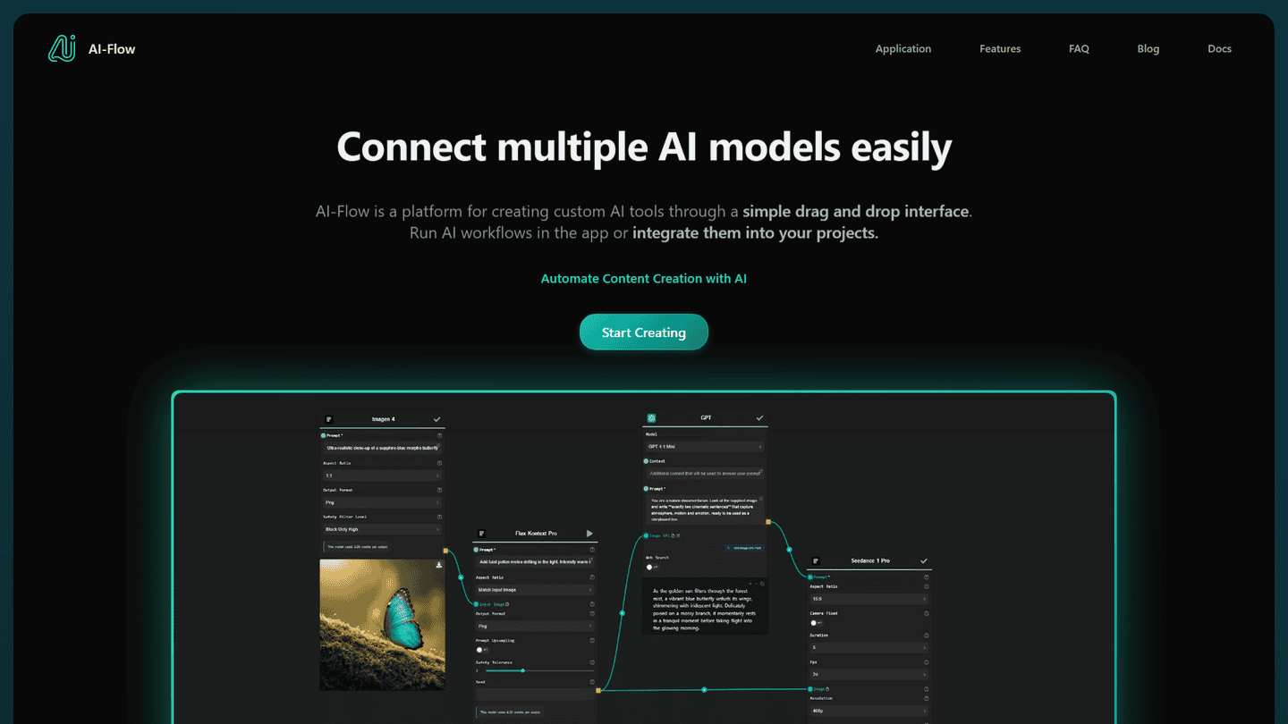 AI-Flow is an open-source platform that connects multiple AI models through an easy-to-use graphical interface. It makes AI accessible to innovators and creators by allowing users to combine different AI models for unique results. With models like GPT-4o, DALL-E 3, Replicate, Claude 3, and Stable Diffusion 3, users can create custom AI tools quickly using a drag-and-drop interface. This enables tasks like creating illustrated stories or summarizing web content in minutes. AI-Flow is also flexible, offering customizable AI solutions to meet specific needs. This makes it suitable for a wide range of users, from individual creators to large corporations.