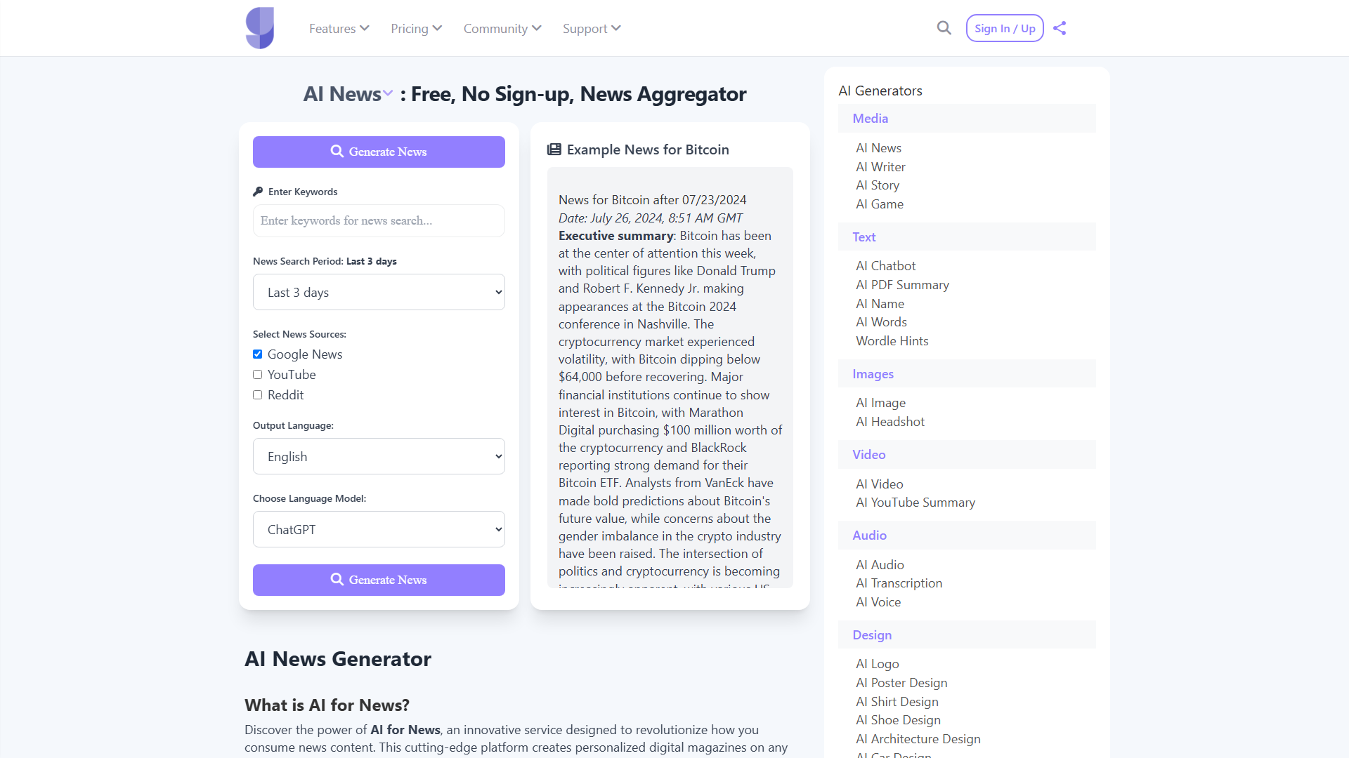AI for News is a sophisticated tool designed to generate news content based on specific keywords. It is intuitive and allows users to input custom search parameters such as the period for the news search and preferred news sources, which include Google News, YouTube, and Reddit. Users are also provided the option to select an output language and a language model like Gemini, ChatGPT, or Claude. Once these selections and input have been made, the system is capable of generating news articles. These articles are precise and targeted as the system is designed to search for and retrieve news content based on the users' specific requests. To illustrate, the tool is able to generate a well-summarized news report on Bitcoin by tracking relevant information from the specified sources within a given period. The tool is versatile, efficient, and effective in generating tailored news content for individuals and organizations based on their unique requirements and preferences.
