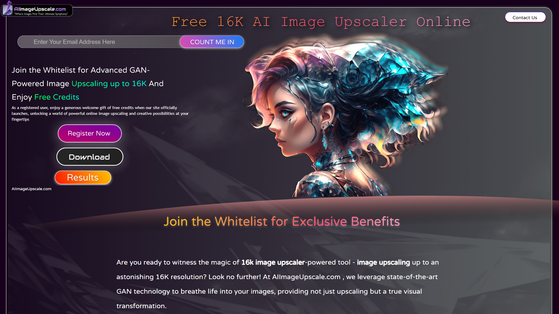 You can join the platform whitelist for early access to AI Image Upscaler by either clicking on the 'Register' button and signing up to become a whitelisted user or by entering your email in the top container and clicking on the 'Count Me In' button.