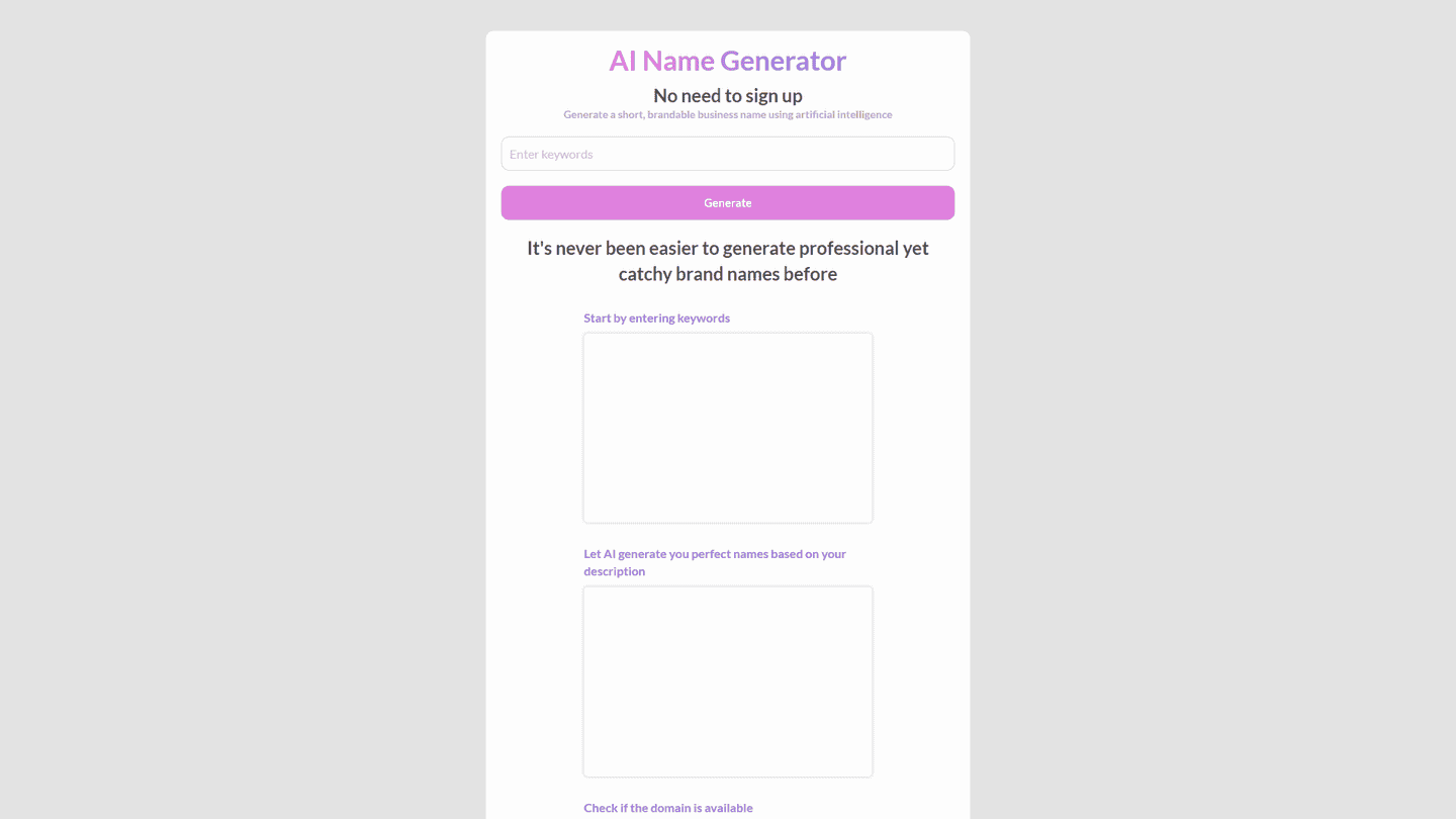 The AI Name Generator operates based on keywords describing a business or brand provided by the user. Utilizing an artificial intelligence system, it creates a list of potential brand names.