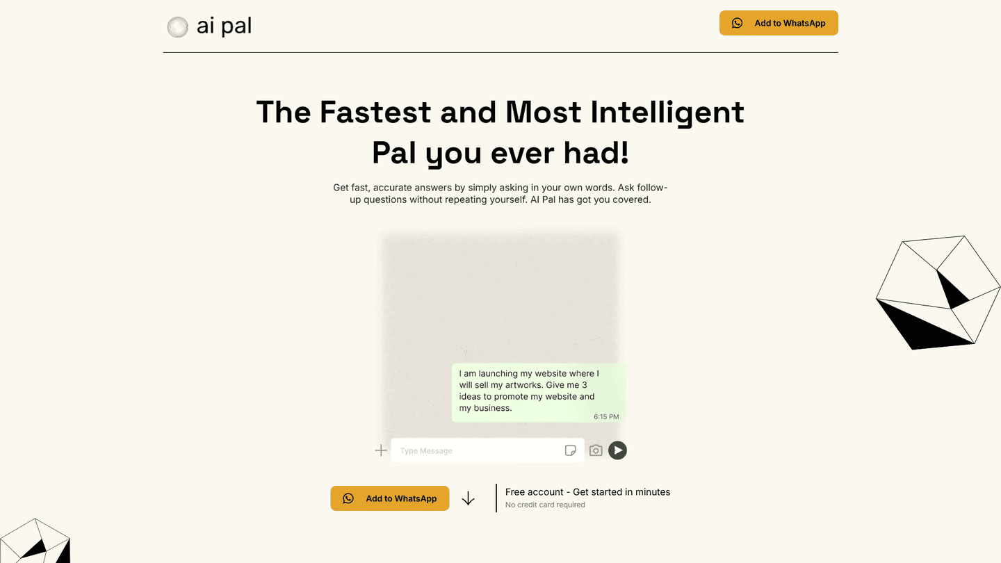 On WhatsApp, AIPAL can provide quick, accurate answers to questions, craft professional emails, generate social media captions, create personalized travel itineraries, assist in conflict resolution, and transform text descriptions into visual inspirations. AIPAL can handle flirty messages, provide quick responses for business or group chats, offer translations, and create to-do lists.