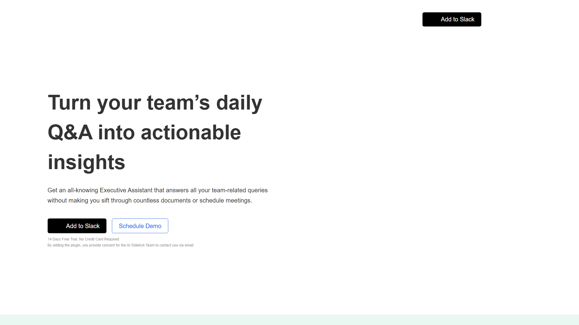 Meet AI Sidekick, your personal GPT-powered Slack assistant. Its like an all-knowing executive assistant that answers team queries without making you sift through docs or meetings. It turns daily Q&A into insights to prevent burnout and identify blockers.