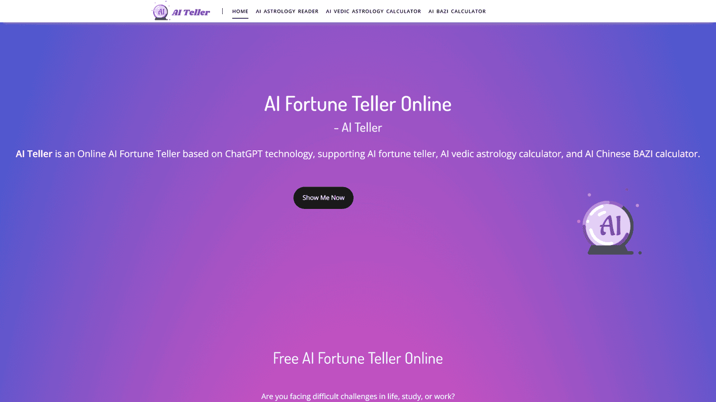 AI Teller provides different astrology calculators rooted in various cultural traditions. These include the AI fortune teller, AI Vedic astrology calculator, and AI Chinese BAZI calculator. Each of these tools draws insights from different astrological systems including ancient Indian Vedic astrology, Western astrology, and Chinese Bazi fortune-telling, offering users a variety of methods for seeking fortune-related insights.