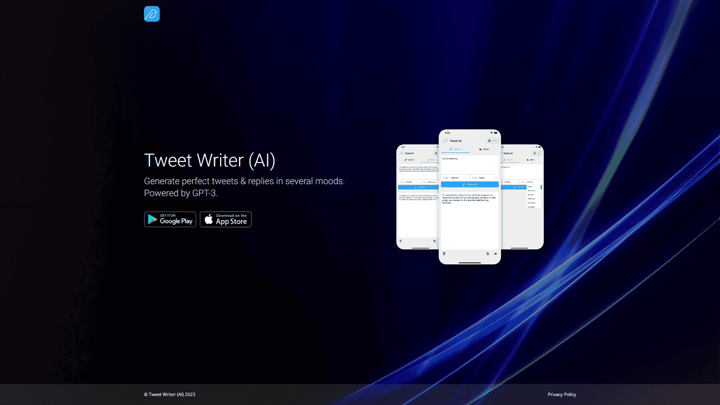 Tweet Writer (AI) is an AI-powered mobile application that utilizes advanced AI language models to generate spot-on tweets and replies in different moods for users, enhancing Twitter engagement and offering unique content creation solutions.