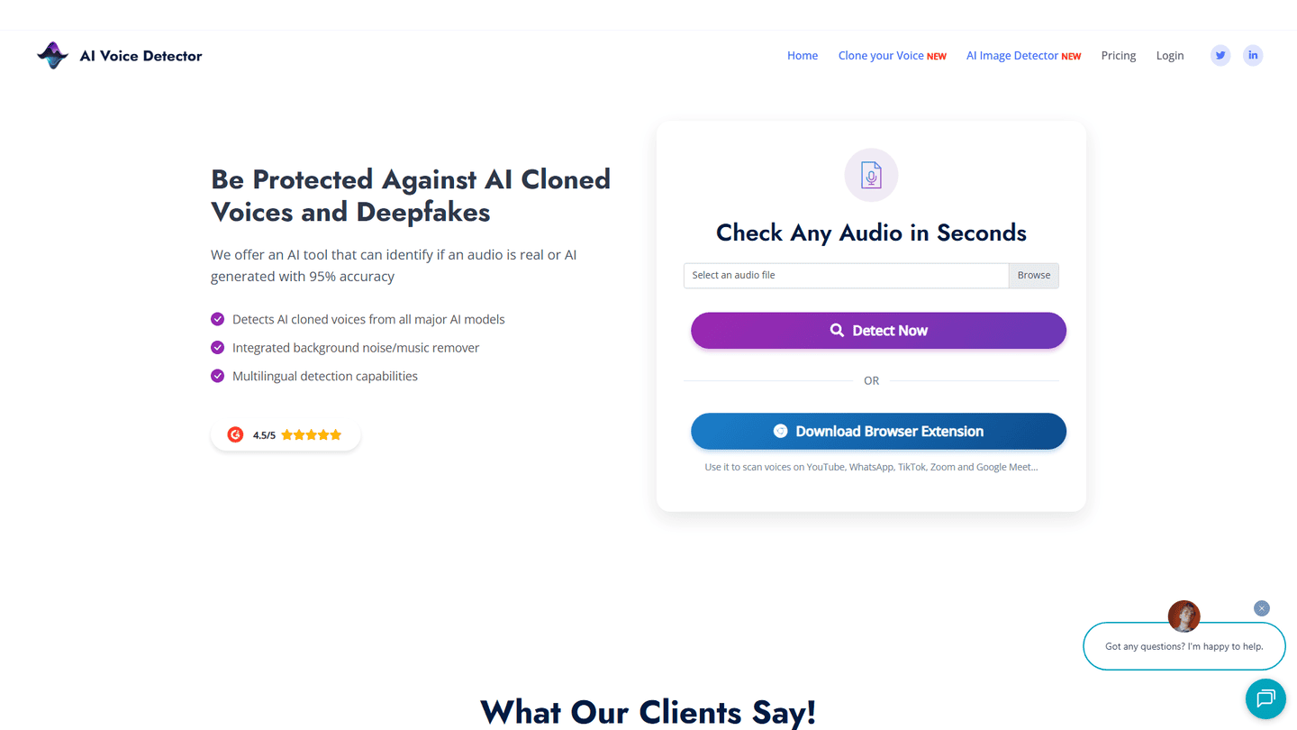 AI Voice Detector is a tool designed to determine the source of an audio file, whether human or AI-generated. This tool protects users against audio manipulation and AI voice frauds. With the rise of sophisticated AI voices, distinguishing between AI generated and human voices has become difficult. AI Voice Detector provides the solution for this, including a browser extension that can be used across various platforms like YouTube, WhatsApp, Tiktok, Zoom and Google Meet. Users can also upload the required audio file directly for detection. Furthermore, this tool offers features to improve detection accuracy, such as an integrated background noise removal utility. The tool is not limited by the duration of the audio file, being able to detect the source in short audios of less than seven seconds. Alongside the browser extension, AI Voice Detector also offers an API for businesses to integrate into their work environment and confirm the authenticity of received audio messages, calls, or meetings. Thus, the tool is useful in individual and business contexts to counteract potentially significant financial losses stemming from AI voice scams.