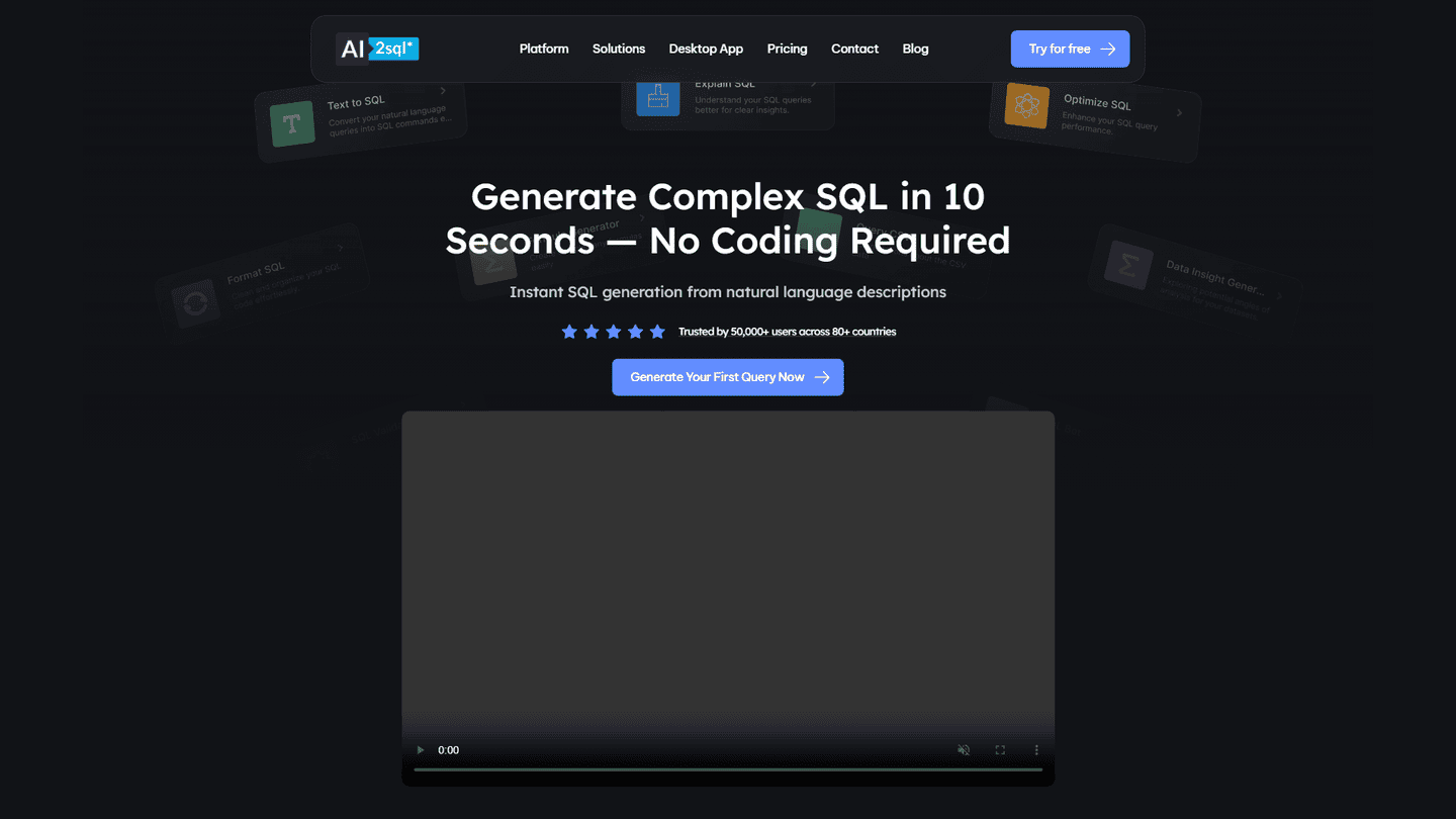AI2SQL is an AI-powered tool that generates SQL (Structured Query Language) queries based on user input. It is designed for users who have little or no SQL knowledge and allows them to create SQL statements quickly and accurately without manual coding. This can boost productivity and reduce the risk of errors - making it a highly beneficial tool for developers, database administrators and other SQL professionals. AI2SQL supports a variety of databases, including SQL, MySQL, PostgreSQL, Microsoft SQL Server, MongoDB, and Pandas and offers natural language prompts in a broad range of languages, such as English, Spanish, French, German, Italian, Portuguese, Chinese, Japanese, and Turkish. Additionally, AI2SQL offers an API for integrating its natural language to SQL translation capabilities into other systems or applications. Users can explore tailored solutions for enterprises, which include on-premises deployment and model fine-tuning to align with specific organizational needs leveraging advanced Large Language Models (LLMs). This not merely enhances the smoothness and precision of translating natural language queries into SQL but also allows for more intuitive interaction with databases.