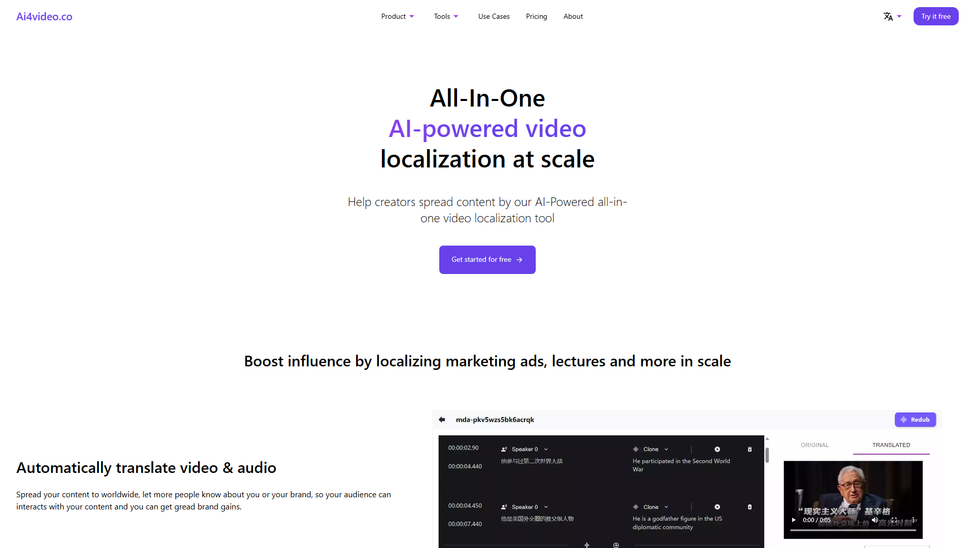 Ai4Video is an AI-powered all-in-one video localization tool designed to help creators spread their content globally. The platform encompasses a suite of features, which include video translation, speaker dubbing, voice cloning, content adjustment, video upscaling, colorization, inpainting and background editing. It enables automatic translation of video and audio content to benefit creators and brands seeking to reach a broader audience. The tool identifies multiple speakers in a video and supports individual dubbing for each one, even offering the possibility of cloning the original speaker's voice for the dubbed content. It also intelligently adjusts content as per the linguistic characteristics of different languages. Besides localization, Ai4Video provides video-editing tools like upscaling video quality from standard definition to HD or 4K, adding colors to black and white videos, and removing unwanted objects or people from a video. It also offers the capability to change video backgrounds. For a more holistic experience, Ai4Video provides features to help identify animals, plants, currencies and landmarks in images. Overall, Ai4Video is a comprehensive toolset for video localization and editing, targeting to enhance user reach and engagement.