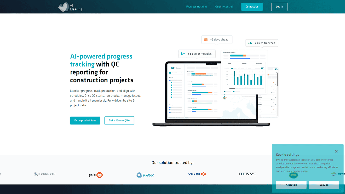 AI Clearing is a digital field construction progress tracking tool that aims to decrease re-work costs and mitigate litigation risk in construction projects. It offers a fully databased solution that leverages machine learning technology, including drone-captured data and advanced 4D geospatial analytics, to generate comprehensive 3D site reports. These reports cover 100% of the construction area, facilitating accurate and efficient progress monitoring. The tool also provides automated and interactive online dashboards and PDF reports, streamlining reporting cycles and offering actionable insights. It can easily integrate with existing systems within organizations, ensuring seamless and efficient data flow. AI Clearing has partnered with renowned companies in the construction industry, indicating its credibility and reliability. It has been recognized as one of the top construction startups, and its solution is significantly faster than traditional quality surveying methods, with AI-based analytics results available overnight.By digitizing the entire construction site and visualizing data, AI Clearing enhances site awareness and reduces supervision costs. It also helps in early discrepancy detection, enabling prompt actions and minimizing issue escalation risks. The tool facilitates communication by providing transparent and real-time progress tracking monitoring reports, streamlining project documentation processes and engagement with stakeholders. Moreover, it assists in operations planning by estimating project deadlines based on the work progress.AI Clearing has proven success in supporting construction projects in various regions, including the US, Canada, Europe, and the Middle East. Its tool combines AI and GIS/CAD technologies to provide accurate and real-time insights into construction progress, elevating trust and productivity in the construction progress monitoring sector.