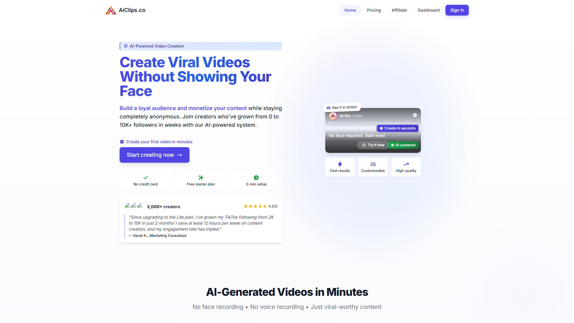 AiClips.co utilizes AI technology to generate unique video content automatically. Its AI engine is capable of producing customized video scripts and integrating high quality images tailored to a user's specific needs, resulting in unique faceless video clips.