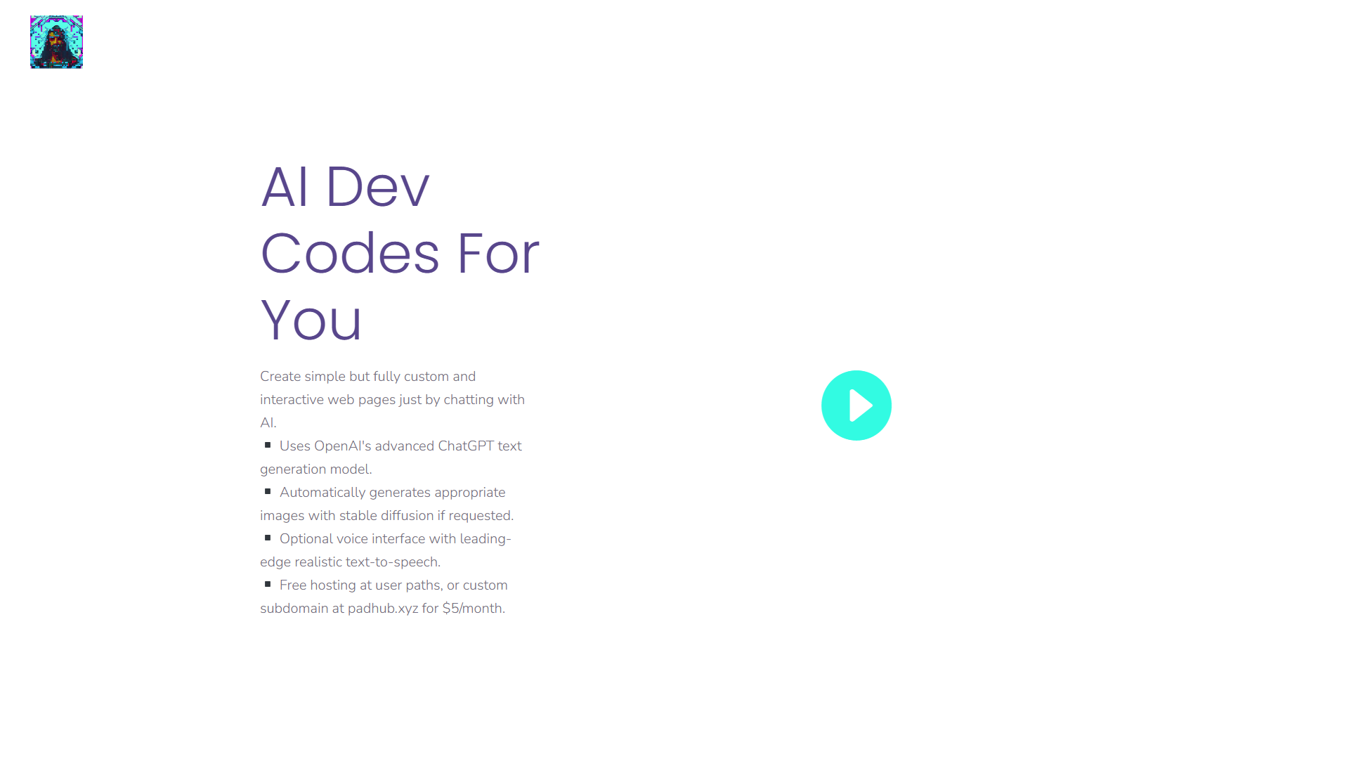 AI Dev Codes is an Artificial Intelligence-powered tool that assists in creating interactive and custom web pages through a chat interface. It uses OpenAI's advanced ChatGPT technology for generating text. Additionally, the tool can autonomously generate relevant images via stable diffusion upon request. An integrated optional voice interface featuring realistic text-to-speech is also provided. The tool offers free hosting at user paths, while custom subdomains are available at an additional cost. The AI Dev Codes platform is beneficial for quickly and effortlessly generating mock-ups for discussions, utilizing prompts and images with Stable Diffusion, creating internal or unique tools requiring basic custom code, utility or informational pages, facilitating illustrated creative writing experiments, and even constructing entire websites. It has been effectively utilized to craft a variety of projects - from a simple order system for a lemonade stand, visual representations of fictional characters such as a Dungeons & Dragons character, generating artistic representations of specified images, and developing informational websites like a site about common birds in South Texas. Future updates promise to include templating features to aid in producing more attractive pages.
