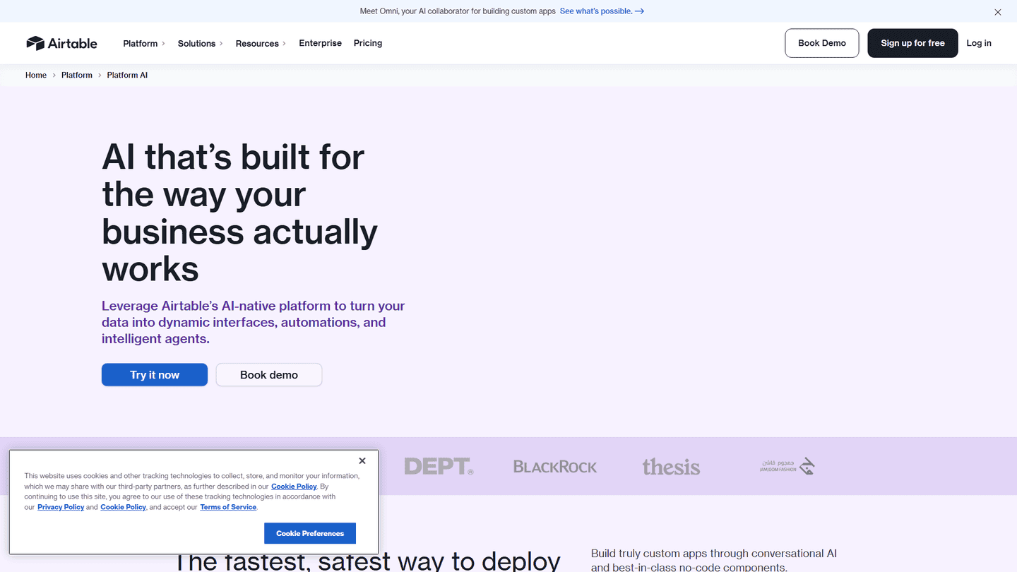 Airtable AI provides a platform for integrating artificial intelligence (AI) functionalities into applications and workflows without the necessity of coding. It aims to fundamentally change operational processes by enabling AI to be included in daily tasks. The tool allows users to build custom business applications that incorporate AI, connecting data from various digital tools to create a centralized data source. With Airtable AI, teams can manage security, permissions, and data protection on a large scale. It features automations for time efficiency, custom data interfaces, tailored data visualizations, and the analysis and sharing of insights. Pre-configured apps are also available to help users get started quickly. Airtable AI integrates seamlessly with platforms like Slack, Google Drive, and Salesforce, among others, enhancing communication and workflow synchronization. Users can leverage customer relationship management (CRM) data across teams and tools, sync work, and simplify tasks. The Airtable AI tool is also capable of analyzing and organizing performance data and customer feedback, aiding in making informed decisions and supporting experimentation without jeopardizing control. It offers the functionality to embed AI within existing workflows and facilitates the secure use of chosen AI models.