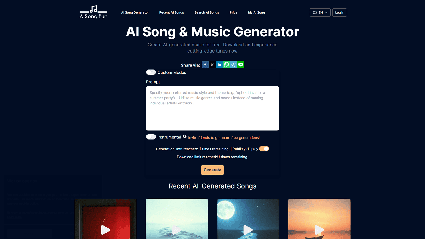 AISong.Fun is a platform designed to harness AI technology for music composition. Users can create their personalized music tracks by choosing a prompt or instrumental and generating a song. The platform can generate a wide range of music styles, including melodies, rhythms, and lyrics, which is particularly helpful for songwriters or enthusiasts looking to explore new creative possibilities. The 'Custom Modes' feature gives users the option to input their own lyrics, song style, and song name, allowing for further personalization of the AI-generated music. This feature enables users to have increased control over the creative aspects of the song, ensuring the generated music aligns with their specific needs and preferences. Despite the platform powering its service free-of-charge, users have the opportunity to subscribe to premium plans to get enhanced features and higher song generation allowances. In addition, users can download the AI-composed music to listen offline or share with others. The platform supports multiple languages, widening its accessibility for users internationally.