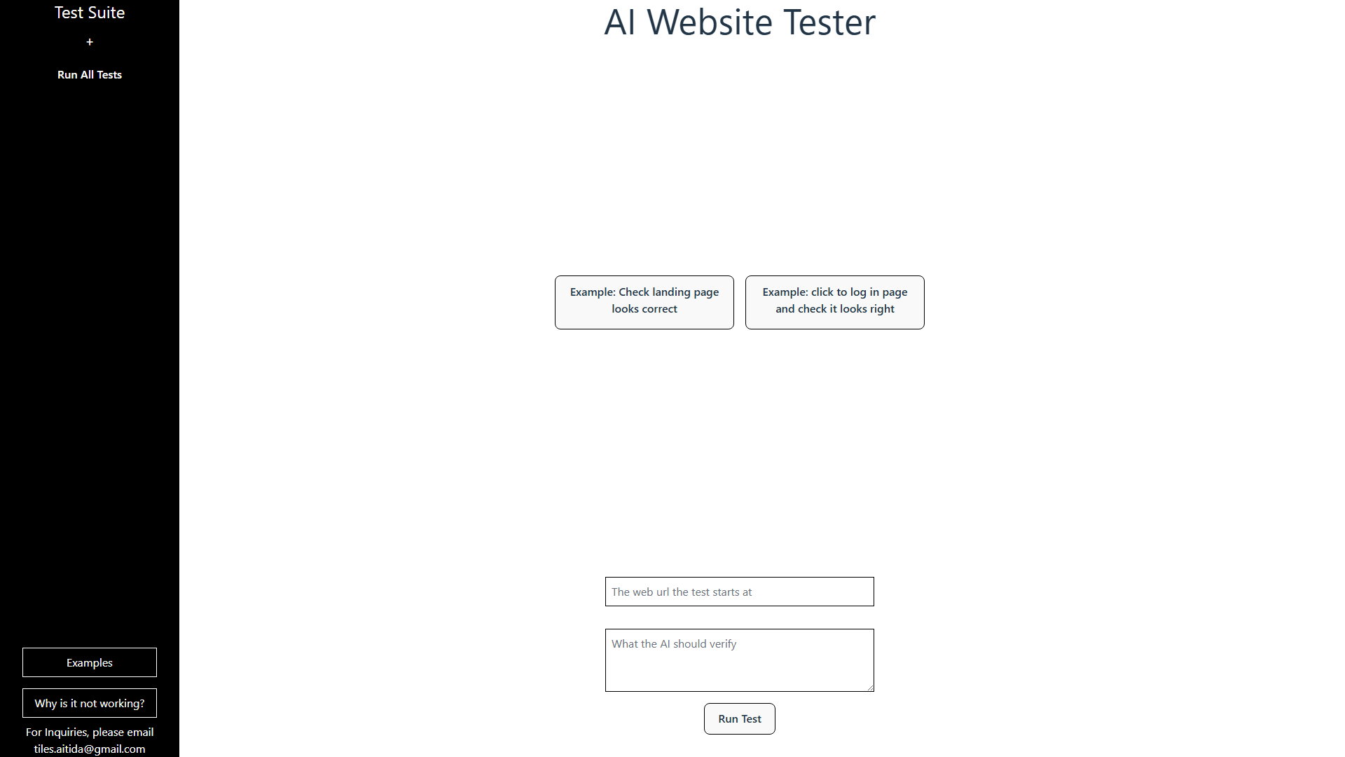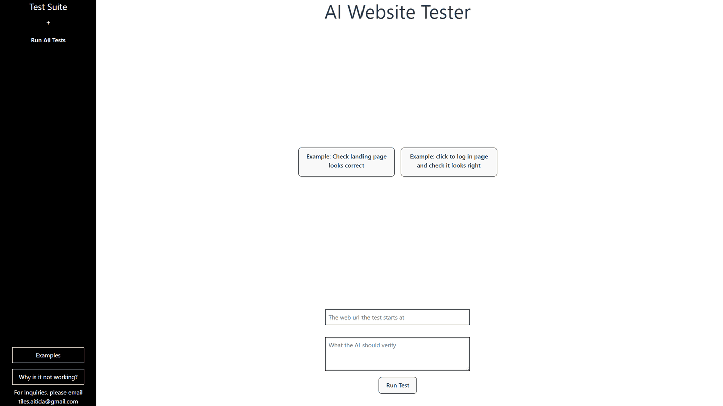 The AI Web Test Aitida Test Suite is designed to perform automated tests on websites to ensure their functionality, appearance, and user experience meet specified standards. This AI tool imitates the user experience by navigating through website pages and performing functions that a regular visitor to the site would. It can effectively evaluate the layout of landing pages and the functionality of log-in processes. In cases where the website does not meet the expected standards or errors are encountered during the evaluation process, the tool highlights these issues to aid in the site's improvement. It can be used for routine checks and quality assurance to uphold the website's standard and usability. For any issues or inquiries related to the tool, there is support available via email to provide solutions or clarifications.