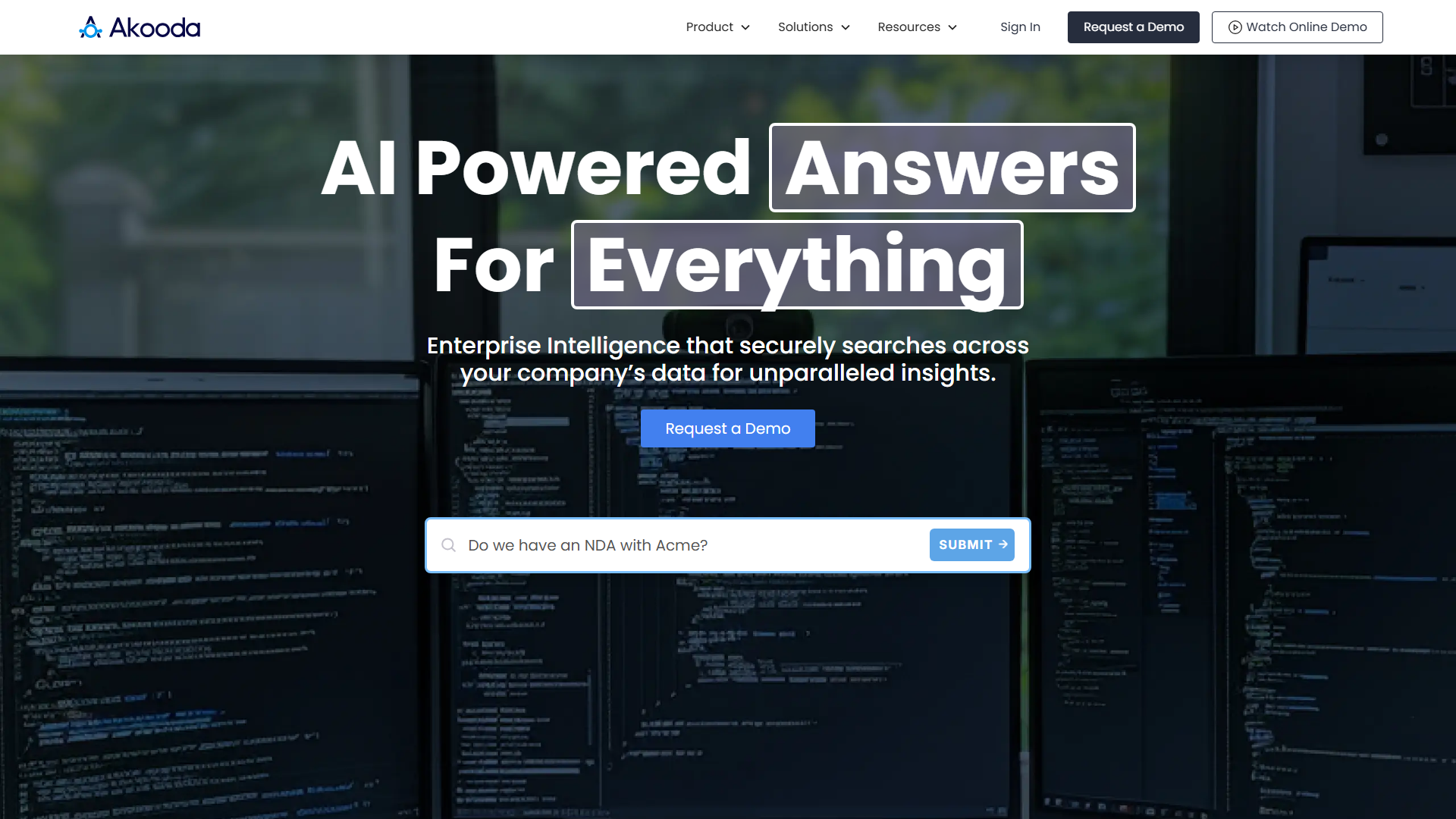Akooda provides comprehensive insights about your company's internal digital footprint such as understanding key business areas like customer churn and pricing. It delivers a curated view of essential information personalized for each user.