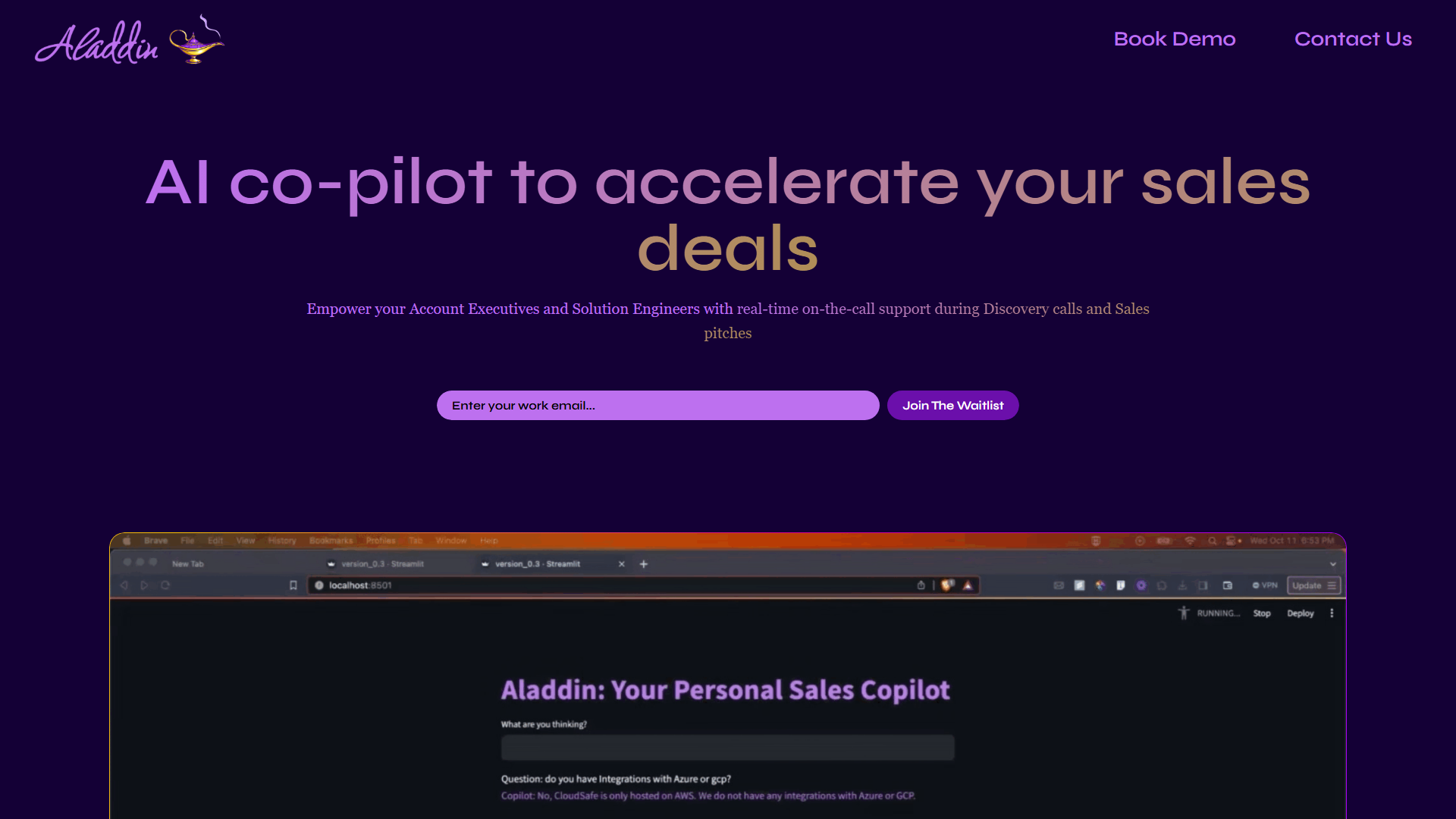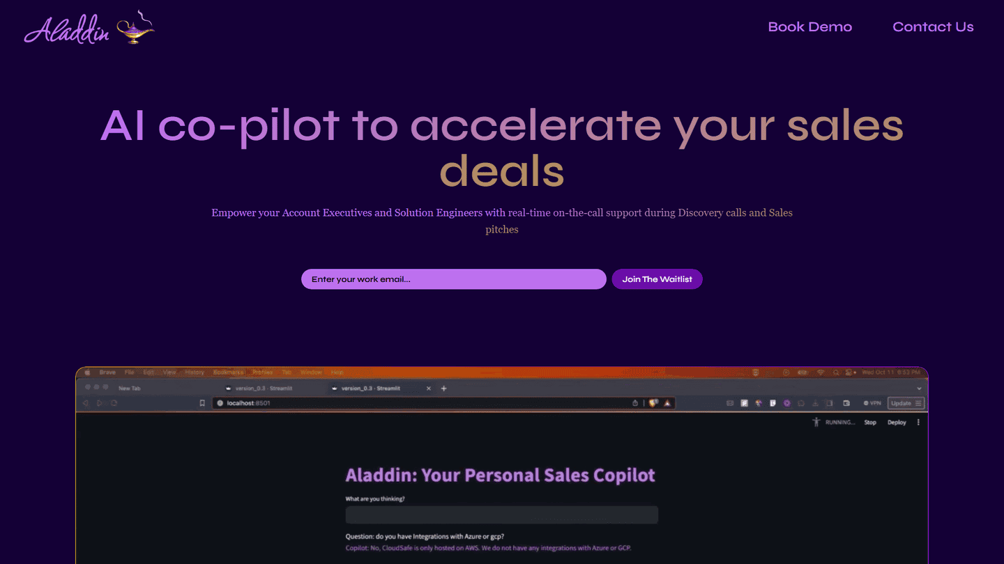 Aladdin AI is a digital tool intended to be a real-time support system for account executives and solution engineers during discovery calls and sales pitches. It acts as a co-pilot to accelerate sales team onboarding.