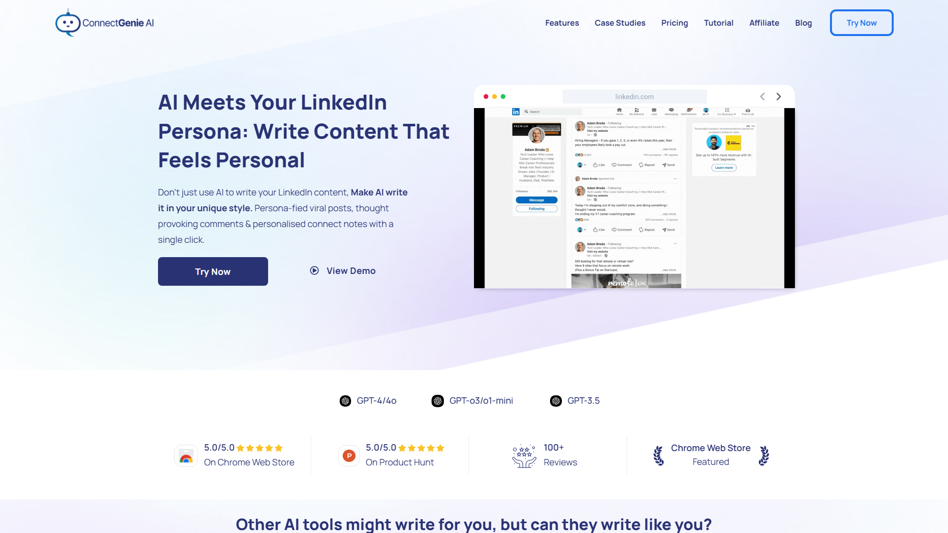 Connect Genie AI is a LinkedIn persona creation tool designed to help professionals and businesses optimize their LinkedIn profiles and content for maximum impact. It analyzes existing LinkedIn profiles and provides data-driven insights to craft compelling and effective personas. The tool helps users identify their ideal audience, understand their needs and pain points, and tailor their content accordingly. This includes suggesting optimal profile pictures, headlines, and about sections, as well as recommending relevant keywords and hashtags to improve search visibility. Connect Genie AI goes beyond simple keyword suggestions; it analyzes the language and tone used by successful professionals in a given industry, helping users emulate best practices. This ensures that their LinkedIn presence aligns with industry standards and resonates with their target audience. The tool is particularly useful for B2B sales professionals, recruiters, and marketing teams seeking to expand their network and generate leads. It simplifies the process of creating a strong LinkedIn presence, saving users time and effort while maximizing their chances of success. By leveraging AI-powered insights, Connect Genie AI empowers users to build a more authentic and effective online brand, leading to increased engagement and opportunities. The platform's user-friendly interface makes it accessible to users with varying levels of technical expertise. While specific features and functionalities may vary depending on the subscription plan, the core focus remains on providing actionable insights to enhance LinkedIn profiles and content.