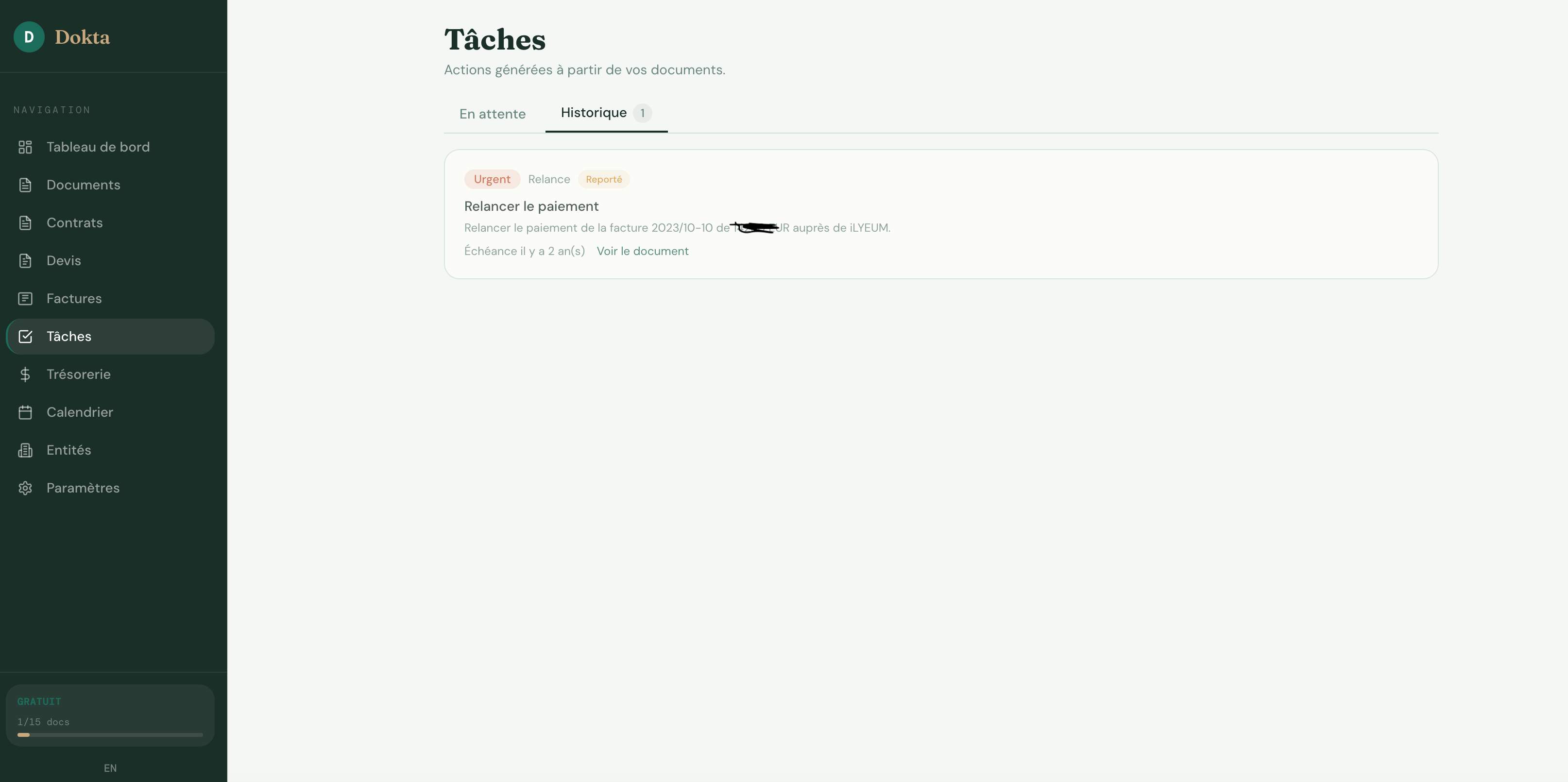 Dokta is an AI-powered document management platform for freelancers, solo entrepreneurs, auto-entrepreneurs, and SMBs. Drop any document — invoice, quote, or contract — and Dokta's AI engine reads, classifies, and extracts key data in under 60 seconds. It handles the full document lifecycle: create professional invoices and quotes, track payments, automate reminders for unpaid invoices, manage contracts and deadlines, and generate tasks from your documents automatically. No more lost files, missed deadlines, or Sunday evenings spent on admin. Dokta builds your client database from your documents, tracks cash flow in real time, and exports to CSV for your accountant. Whether you're a freelance developer, a consultant, a trades contractor, or a growing SMB — Dokta puts your documents at the heart of your business, managed by AI. Free tier: 15 docs/month. Plans from €9/month. 100% GDPR, hosted in Europe (AWS).