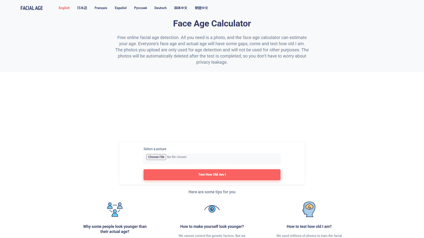 The tool offers AI-powered age detection based on an uploaded facial image. It uses facial recognition algorithms to analyze features and estimate an age range. The process is quick and easy to use.