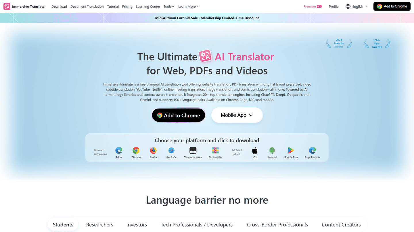 The term "Immersive Translate" was coined by us. Today, it has become synonymous with "bilingual contrastive translation." Since its launch in 2023, this acclaimed AI bilingual webpage translation extension has helped over 10 million users overcome language barriers and freely access global knowledge. We believe that breaking down language barriers promotes information equity.