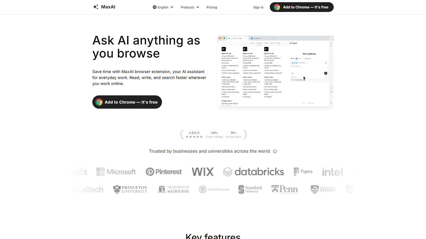 MaxAI is a browsing assistance AI tool designed to streamline and enhance online research. It leverages AI to intelligently summarize web pages, extract key information, and compare different sources, saving users significant time and effort. The tool's core functionality centers around providing concise summaries of lengthy articles, allowing users to quickly grasp the main points without needing to read the entire text. Beyond summarization, MaxAI can identify and extract specific data points from web pages, such as contact information, pricing details, or technical specifications. This feature is particularly useful for tasks like market research or competitor analysis. Furthermore, MaxAI can compare multiple sources on a given topic, highlighting similarities and differences to provide a comprehensive overview. The target audience includes researchers, students, journalists, and anyone who regularly needs to process large amounts of online information. MaxAI's unique selling proposition lies in its ability to not only summarize but also intelligently compare and contrast information from various sources, offering a more holistic understanding than simply aggregating summaries. The tool works by using advanced natural language processing (NLP) and machine learning (ML) algorithms to analyze web page content, identify key entities, and generate concise, informative summaries and comparisons. While specific technical details about the algorithms are not publicly available, the user experience suggests a robust and efficient system.