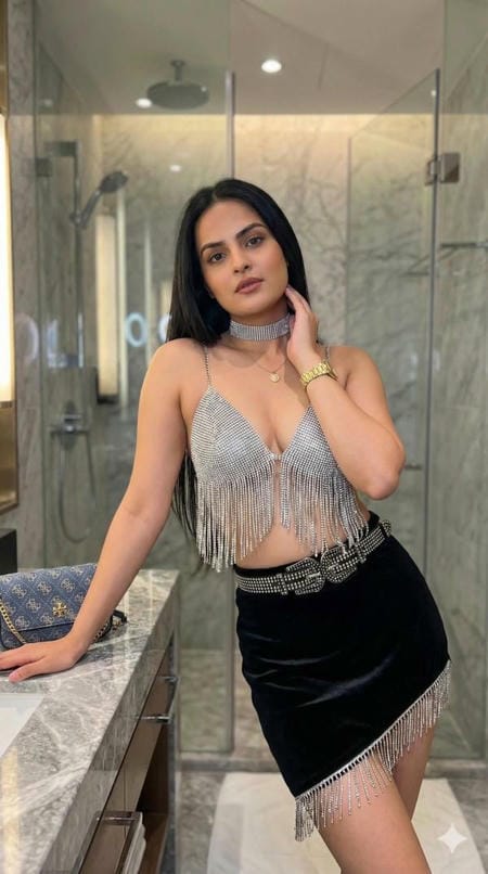 Roupa: Um top bandeau justo e sem alças em um bege-dourado quente envolvendo o peito, combinado com uma calcinha de cintura baixa da mesma cor. Uma delicada e fina corrente de ouro na barriga, envolvendo o baixo ventre, adiciona um toque sutil.