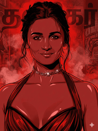 Create a cinematic digital illustration of the person in the reference photo. Maintain the exact face, identity, hairstyle, expression, skin tone, and pose with zero distortion. Transform the entire scene into a deep red high-contrast Tamil gangster movie poster style. Replace the background with red gradients, smoky, atmosphere, and subtle textures. Add bold comic-book shading, thick outlines, st...
