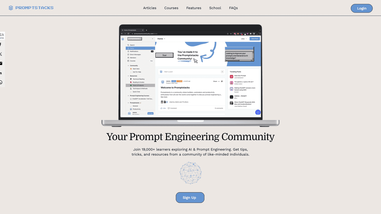 PromptStacks FeaturesThey offer a suite of free vetted prompts curated for large language models such as ChatGPT and delivered through prompt engineering so that you can spend your time on important things. There's also a community associated with it where you can see the top voted prompts, submit prompts or join their discord.