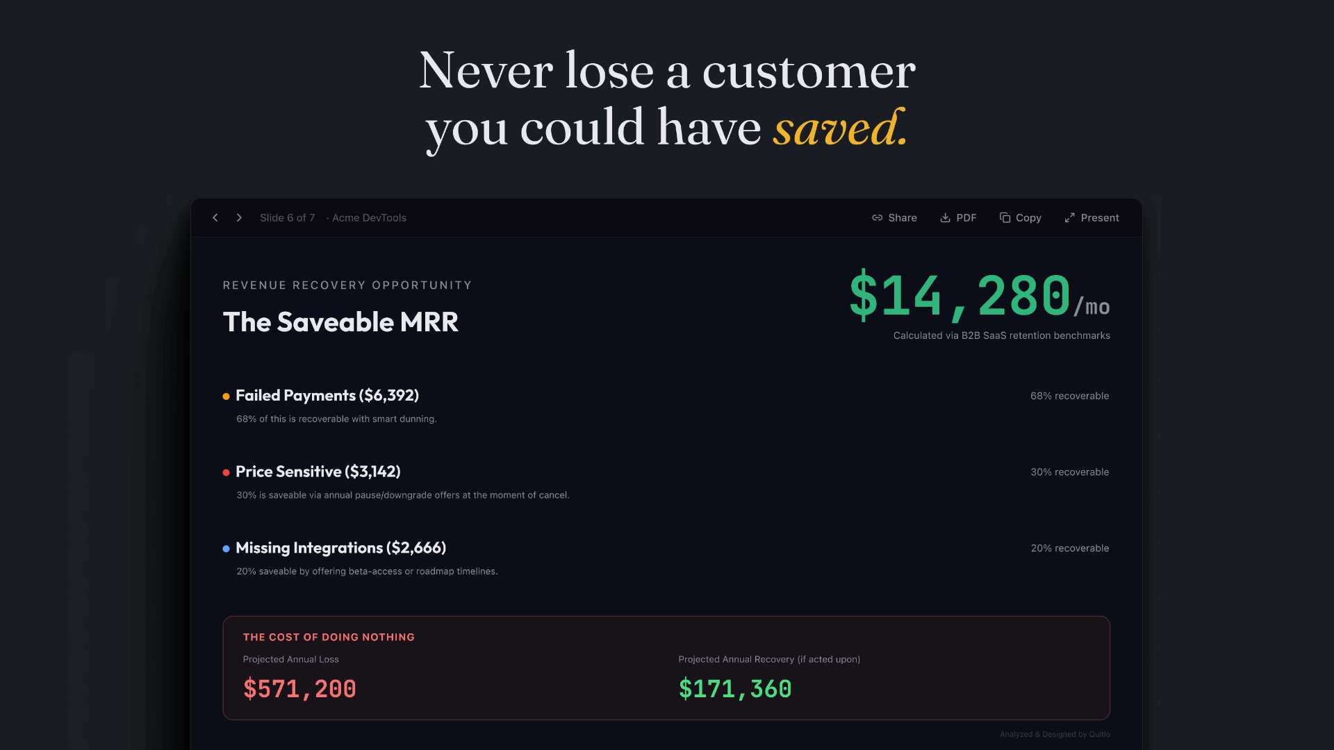 Quitlo also includes the 'Retention Deck', a free tool that analyzes your Stripe data to calculate your 'Saveable MRR' in 15 seconds.