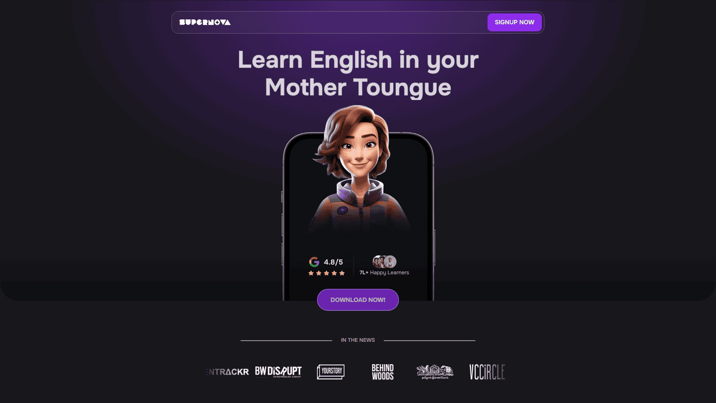 Supernova AI Spoken English is an AI-powered platform designed to help users improve their spoken English fluency and pronunciation. It leverages advanced speech recognition and natural language processing to provide personalized feedback and guidance. The platform offers a variety of features, including interactive lessons, personalized practice sessions, and real-time feedback on pronunciation, intonation, and fluency. Users can engage with AI-powered conversation partners to practice speaking in different contexts and scenarios. The platform adapts to the user's individual learning style and pace, providing customized exercises and challenges to keep them engaged and motivated. Supernova AI Spoken English is particularly useful for individuals preparing for English proficiency exams like TOEFL or IELTS, professionals seeking to improve their communication skills for work, or anyone looking to enhance their overall English speaking abilities. The platform's unique selling points include its personalized learning paths, AI-driven feedback, and engaging interactive exercises. It works by analyzing the user's speech patterns, identifying areas for improvement, and providing targeted feedback and practice opportunities. The platform tracks user progress and provides insights into their strengths and weaknesses, allowing them to monitor their improvement over time. The platform's user-friendly interface and gamified learning experience make the process of learning English enjoyable and effective.
