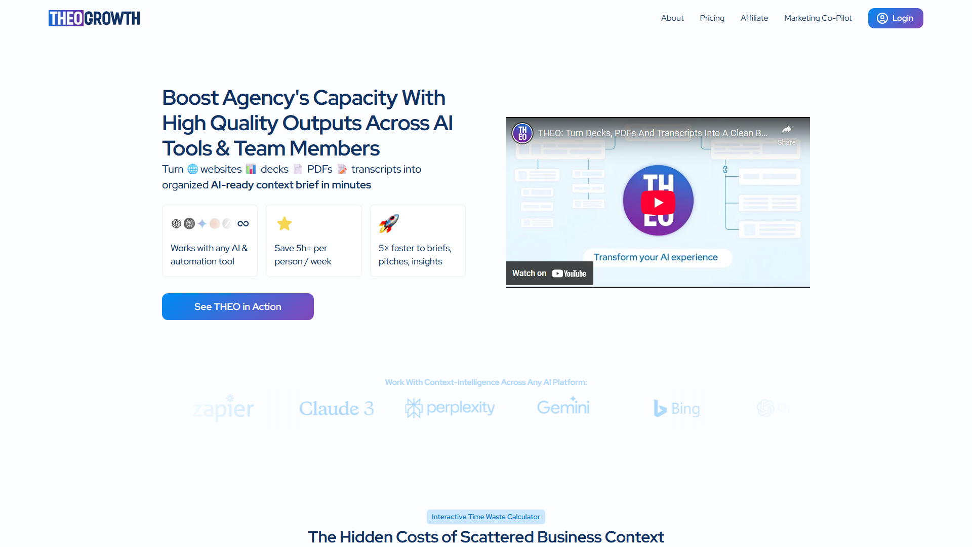 In just minutes, with a 2-minute setup, zero technical skills, and no learning curve, THEO transforms scattered documents and URLs into a perfectly AI-optimized format. This streamlined process empowers AI tools and assistants to fully understand your unique business, reducing iteration cycles by 5-10x and enabling faster, more relevant and consistent results from your existing workflows - saving at least 6+ per week per team member. (Instantly)