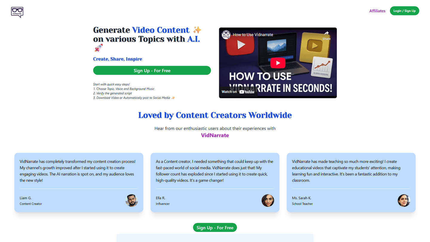 VidNarrate is an AI-powered video creation platform specializing in generating faceless videos from text scripts. Its core functionality revolves around transforming written content into engaging visual narratives using a variety of customizable avatars. Users simply input their script, select an avatar style, and VidNarrate handles the rest, generating a professional-looking video with voiceover and animations. This eliminates the need for expensive video production equipment, actors, and editing software, making high-quality video creation accessible to a broader audience. The platform is particularly useful for creating explainer videos, marketing materials, e-learning modules, and internal communications. The various avatar options allow for customization to match brand aesthetics or project requirements. VidNarrate's target audience includes marketers, educators, entrepreneurs, and anyone needing to create professional videos quickly and efficiently. Its unique selling proposition lies in its ease of use, affordability, and the ability to produce high-quality videos without the need for extensive video production expertise. The platform's AI handles the entire process, from text-to-speech conversion and lip-sync synchronization to background music selection and video rendering. Users can further customize their videos by adding their own branding elements and music tracks. Overall, VidNarrate offers a streamlined and efficient solution for creating engaging and professional faceless videos.
