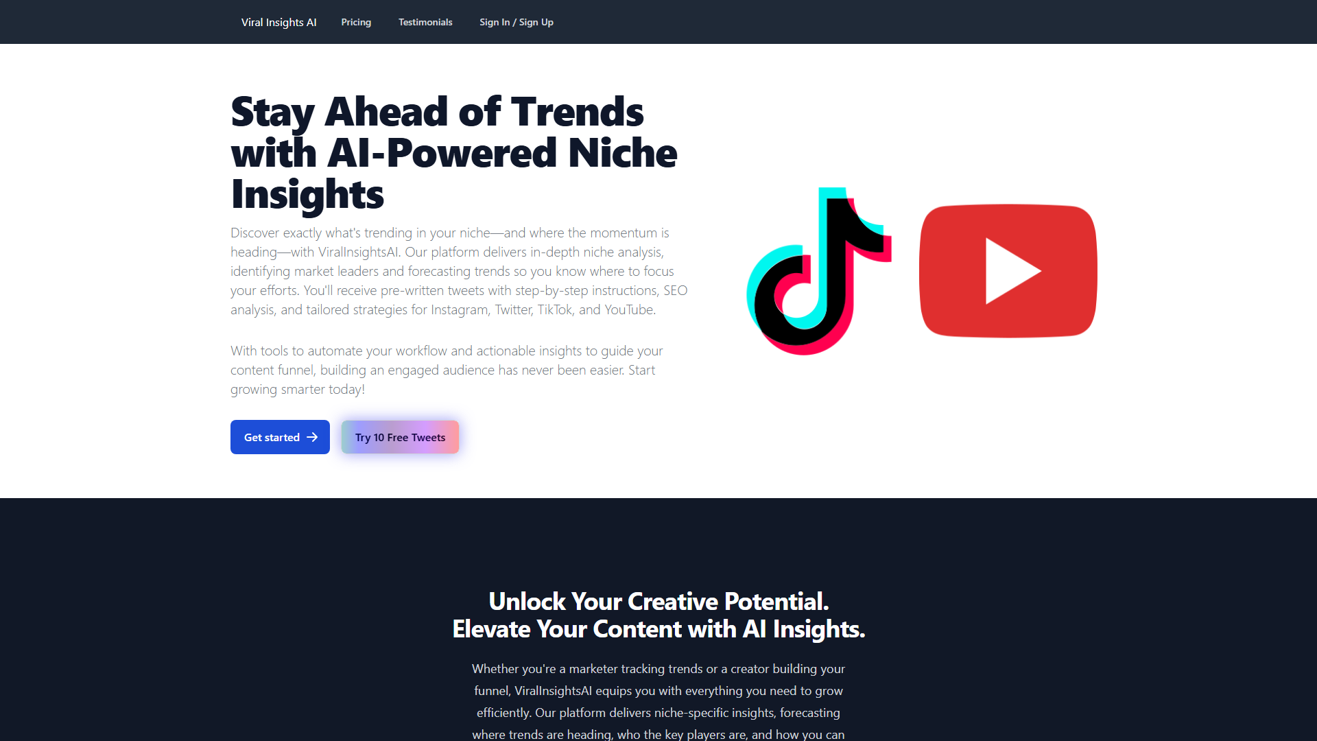 Viral Insights AI is a trend analysis tool designed to help businesses and individuals understand and leverage trending topics across various social media platforms. It analyzes vast amounts of data to identify emerging trends, predict viral potential, and provide actionable insights. The platform offers features such as keyword tracking, sentiment analysis, competitor analysis, and trend forecasting. Users can monitor specific keywords, hashtags, or topics to track their performance and identify potential opportunities. Sentiment analysis helps gauge public opinion on a particular trend, allowing for proactive responses and informed decision-making. Competitor analysis allows users to benchmark their performance against competitors and identify areas for improvement. Trend forecasting uses advanced algorithms to predict the future trajectory of trends, enabling proactive planning and strategic resource allocation. The target audience includes marketers, social media managers, researchers, and anyone interested in understanding and capitalizing on trending topics. Viral Insights AI's unique selling points include its comprehensive data analysis capabilities, user-friendly interface, and accurate trend predictions. The tool works by continuously monitoring social media platforms, collecting relevant data, and processing it using sophisticated algorithms to identify patterns and trends. This information is then presented in an easily digestible format, allowing users to quickly understand the current trends and make informed decisions.