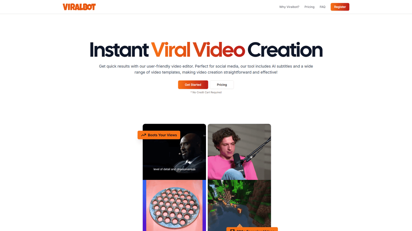 Whether you're an influencer, marketer, or content creator, ViralBot empowers you to produce high-quality, eye-catching videos that captivate your audience. Our user-friendly interface makes it easy to generate videos that stand out, increase engagement, and grow your online presence.