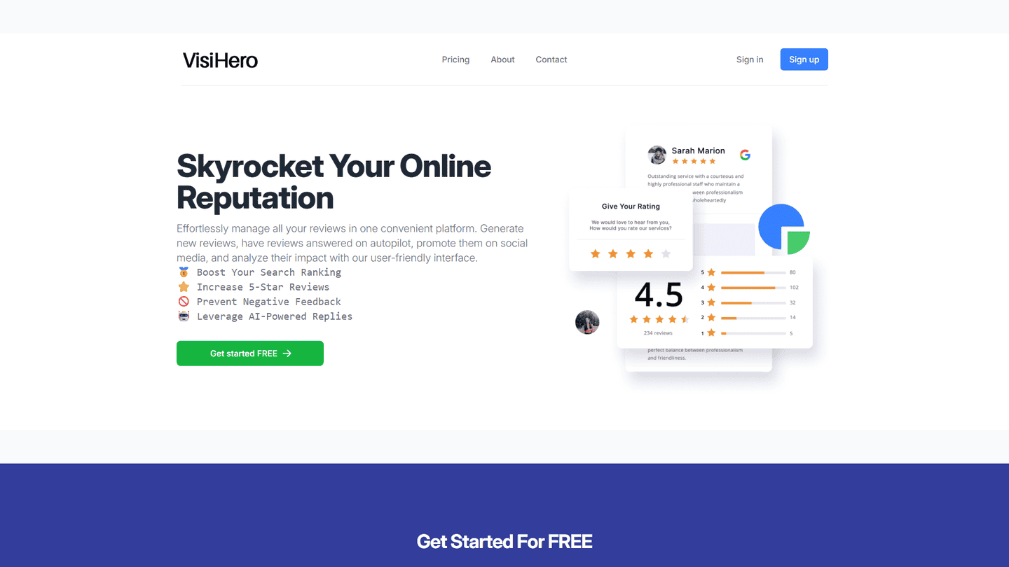 Visihero is an AI-powered video editing tool designed to simplify the creation of professional-looking videos. Its primary task is reviews management, and it also assists with video creation, editing, transcription, and marketing.