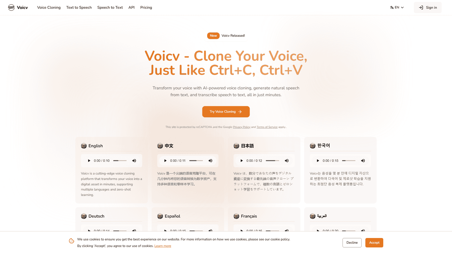 Voicv offers a user-friendly interface and produces high-quality voice clones (as claimed). Its applications are diverse, spanning various content creation and accessibility needs.