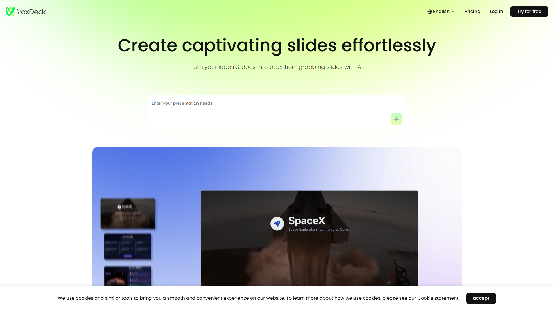 VoxDeck is an AI-powered presentation tool that transforms text into engaging presentations with stunning visuals and speaker notes, streamlining the creation process.