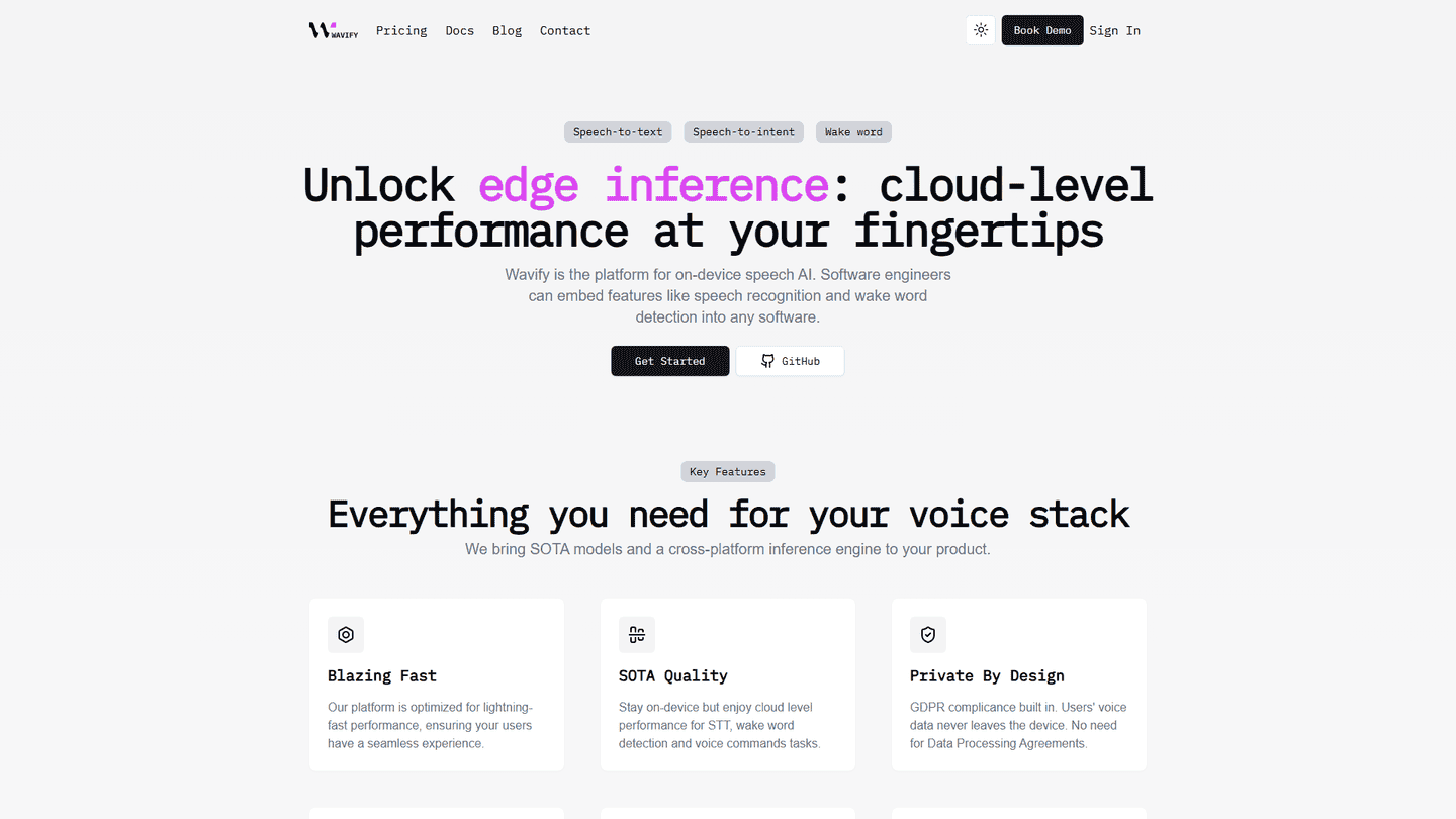 Wavify is a cutting-edge speech-to-text API meticulously crafted for developers seeking a robust and adaptable solution. Its core strength lies in its speed and accuracy, ensuring transcriptions are delivered quickly and reliably. Wavify distinguishes itself through its customizable models, allowing developers to tailor the API to their specific needs and the nuances of their target audio. This flexibility is particularly valuable in scenarios requiring specialized vocabulary or accent recognition. The API supports a range of audio formats and offers various features such as punctuation and capitalization, enhancing the readability and usability of the transcribed text. Wavify's target audience includes developers building applications requiring real-time transcription, such as voice assistants, transcription services, and accessibility tools. Its unique selling proposition is the combination of speed, accuracy, and customization, empowering developers to create highly tailored speech-to-text experiences. The API works by processing audio input, leveraging advanced machine learning models to convert the audio signal into text. Developers can integrate Wavify seamlessly into their applications using straightforward APIs and well-documented SDKs. The service prioritizes data privacy and security, ensuring user data is handled responsibly and ethically. Overall, Wavify offers a powerful, flexible, and efficient solution for developers needing a high-performance speech-to-text engine.