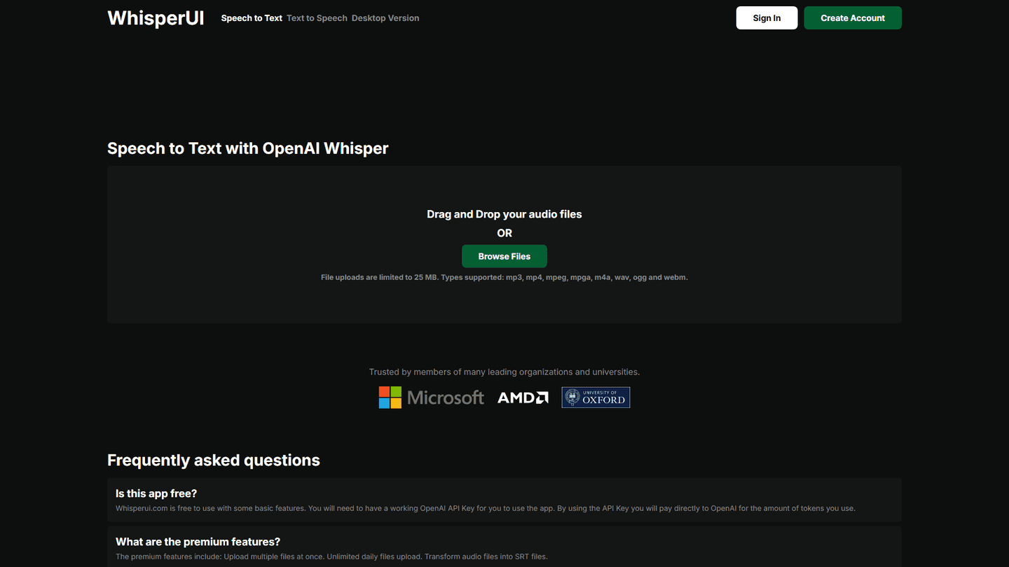Whisperui.com is free to use with some basic features. You will need to have a working OpenAI API Key for you to use the app. By using the API Key you will pay directly to OpenAI for the amount of tokens you use.