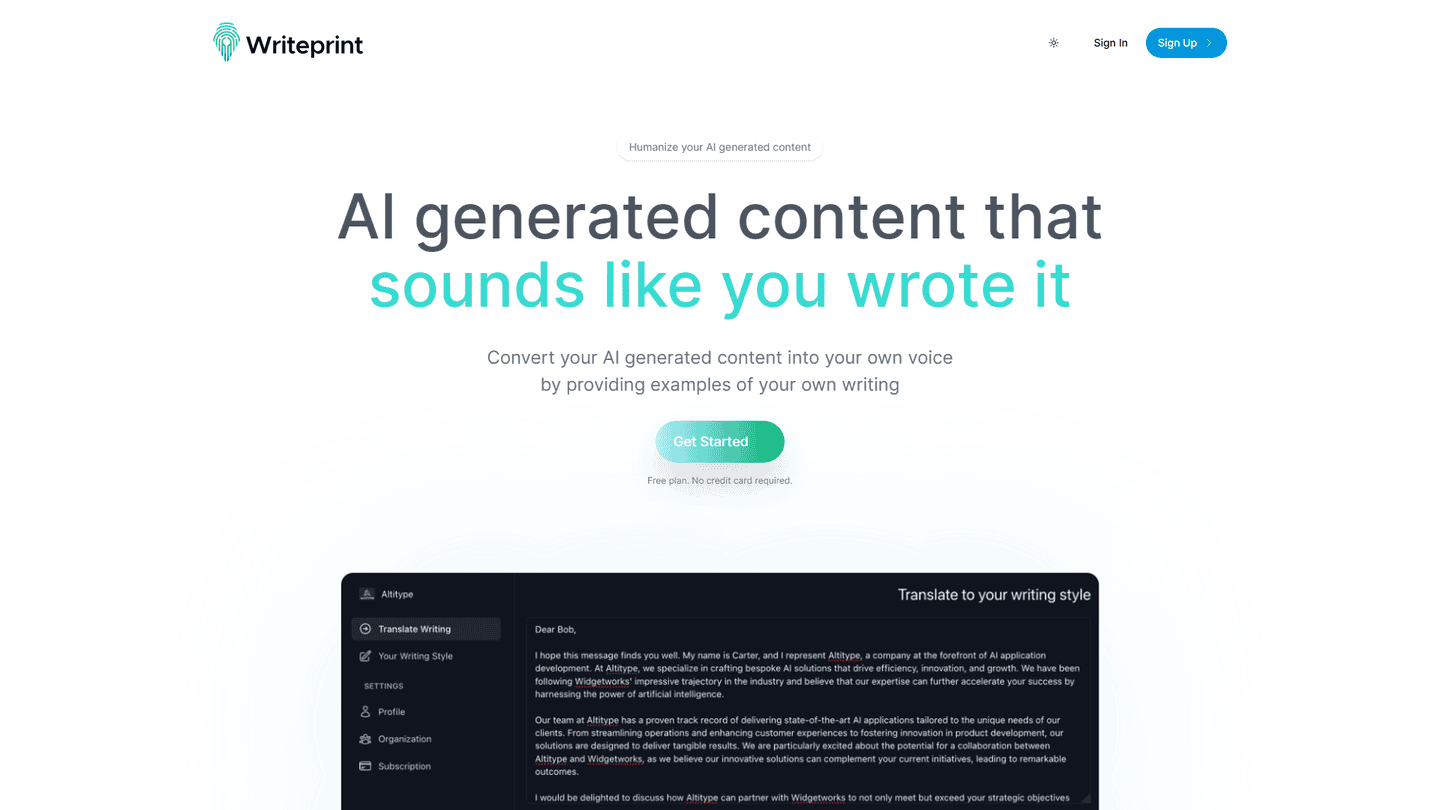 Writeprint.ai is an AI-powered writing assistant designed to streamline the content creation process. It offers a range of features aimed at improving both the quality and speed of writing. Users can leverage the tool to generate ideas, overcome writer's block, and refine existing content. The platform likely employs advanced natural language processing (NLP) algorithms to understand context, suggest relevant keywords, and offer stylistic improvements. While specific features aren't explicitly detailed on the website, it's reasonable to assume capabilities such as grammar and spell checking, plagiarism detection, and tone adjustment are included. The target audience appears to be broad, encompassing bloggers, marketers, students, and anyone seeking to enhance their writing output. Writeprint.ai's unique selling proposition likely lies in its ability to provide personalized writing assistance tailored to the user's specific needs and writing style. The platform likely works by analyzing the user's input and providing suggestions in real-time, allowing for iterative improvement of the text. This collaborative approach aims to empower users to create high-quality content efficiently, without sacrificing creativity or originality. The platform's ease of use and intuitive interface are likely key factors contributing to its user-friendliness. Overall, Writeprint.ai presents itself as a valuable tool for anyone looking to improve their writing skills and boost their content creation workflow.