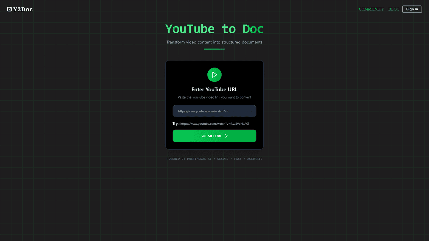 Y2Doc leverages AI to provide fast and accurate transcriptions of YouTube videos. Users simply paste a YouTube video link, and the tool processes it to generate a clean, editable transcript. Key features include the ability to export transcripts in various formats like TXT, DOCX, and PDF, making it suitable for diverse needs. The platform also offers features to enhance the transcriptions, such as editing capabilities to correct any inaccuracies and the option to add timestamps for easy navigation. Y2Doc caters to a wide audience, including students, researchers, journalists, and content creators who need accurate and readily accessible transcripts of YouTube videos. Its speed and accuracy are key selling points, saving users significant time and effort compared to manual transcription. The user-friendly interface makes it accessible even to those without technical expertise. Y2Doc's AI engine continuously learns and improves its accuracy, ensuring high-quality results. The process involves the AI analyzing the audio from the YouTube video, identifying speech patterns, and converting them into text. This automated process significantly reduces the time and cost associated with traditional transcription methods. The platform's focus on accuracy and ease of use positions it as a valuable tool for anyone working with YouTube video content.